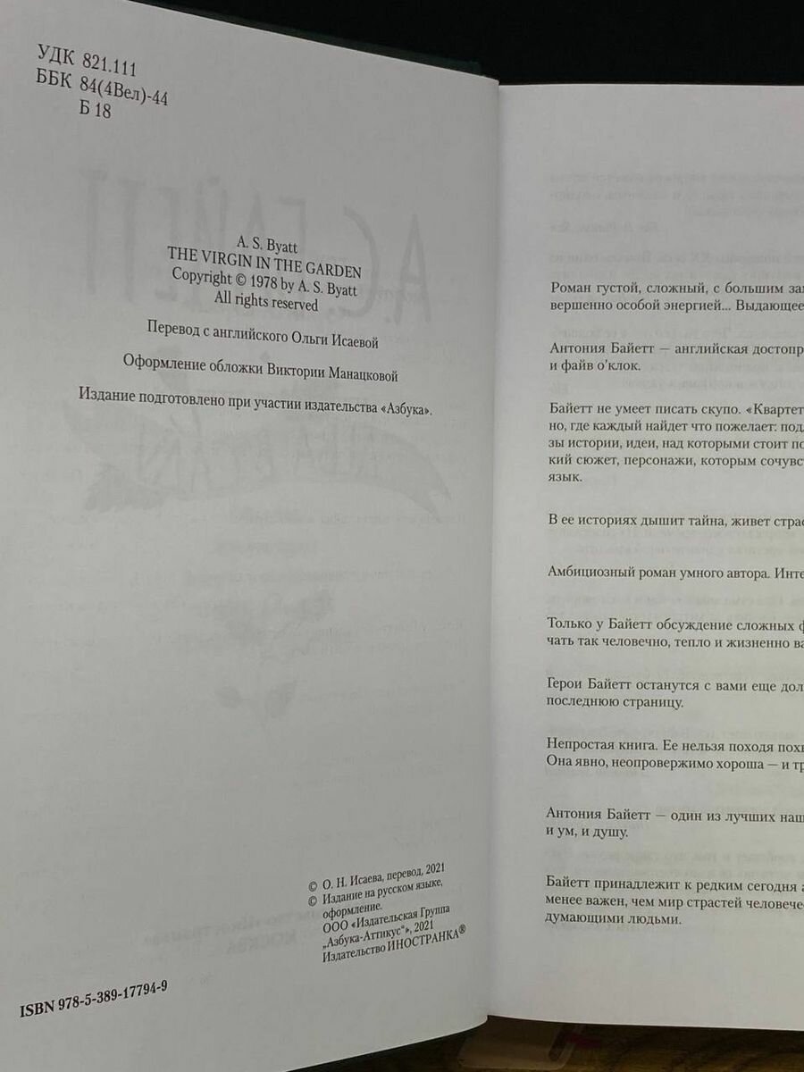 ""Дева в саду" - современный эпос сродни искусно сотканному, богатому ковру. Герои Байетт задают главные вопросы своего времени. Их голоса звучат искренне, порой сбиваясь, порой достигая удивительной красоты" (Entertainment Weekly)