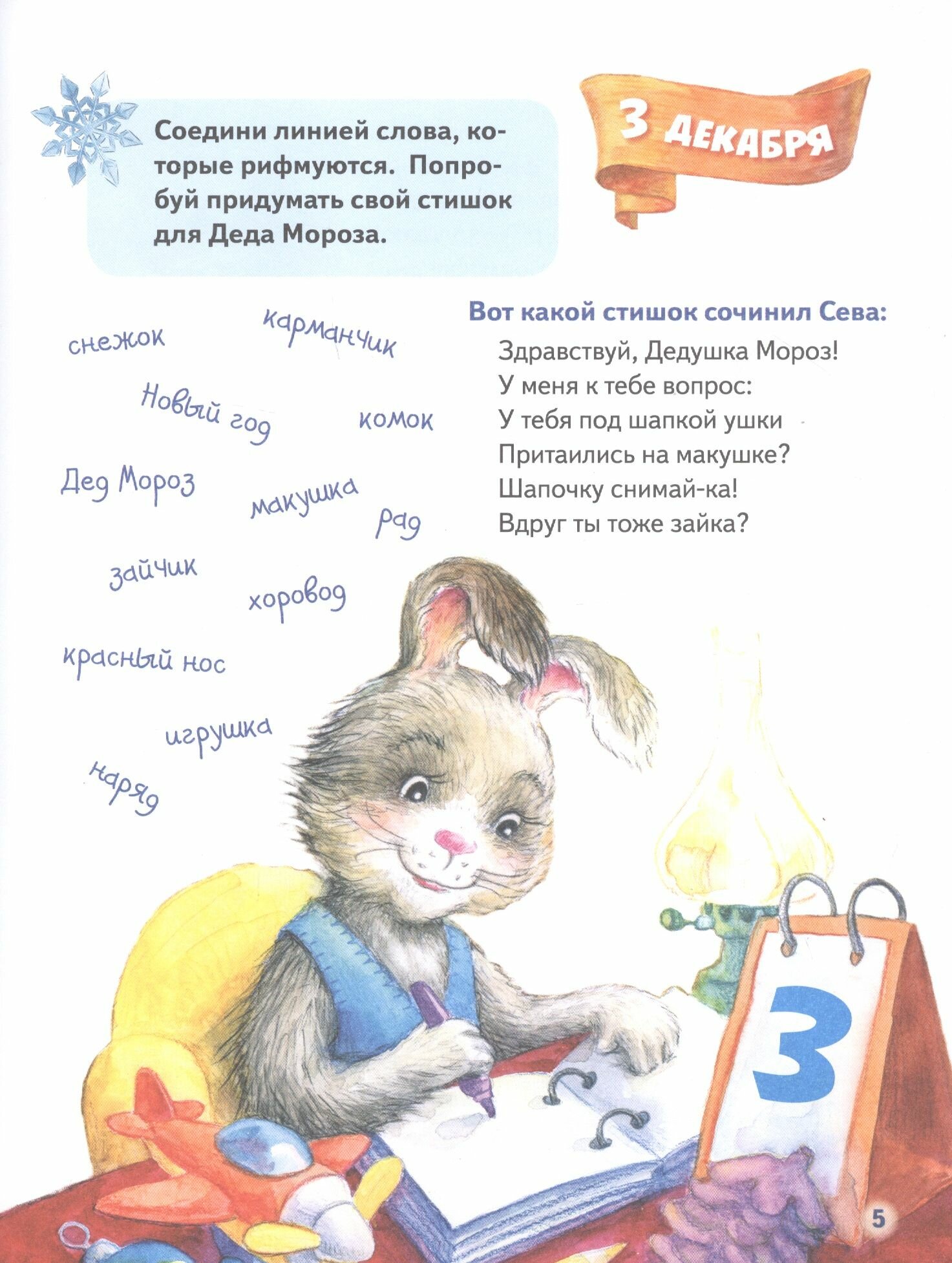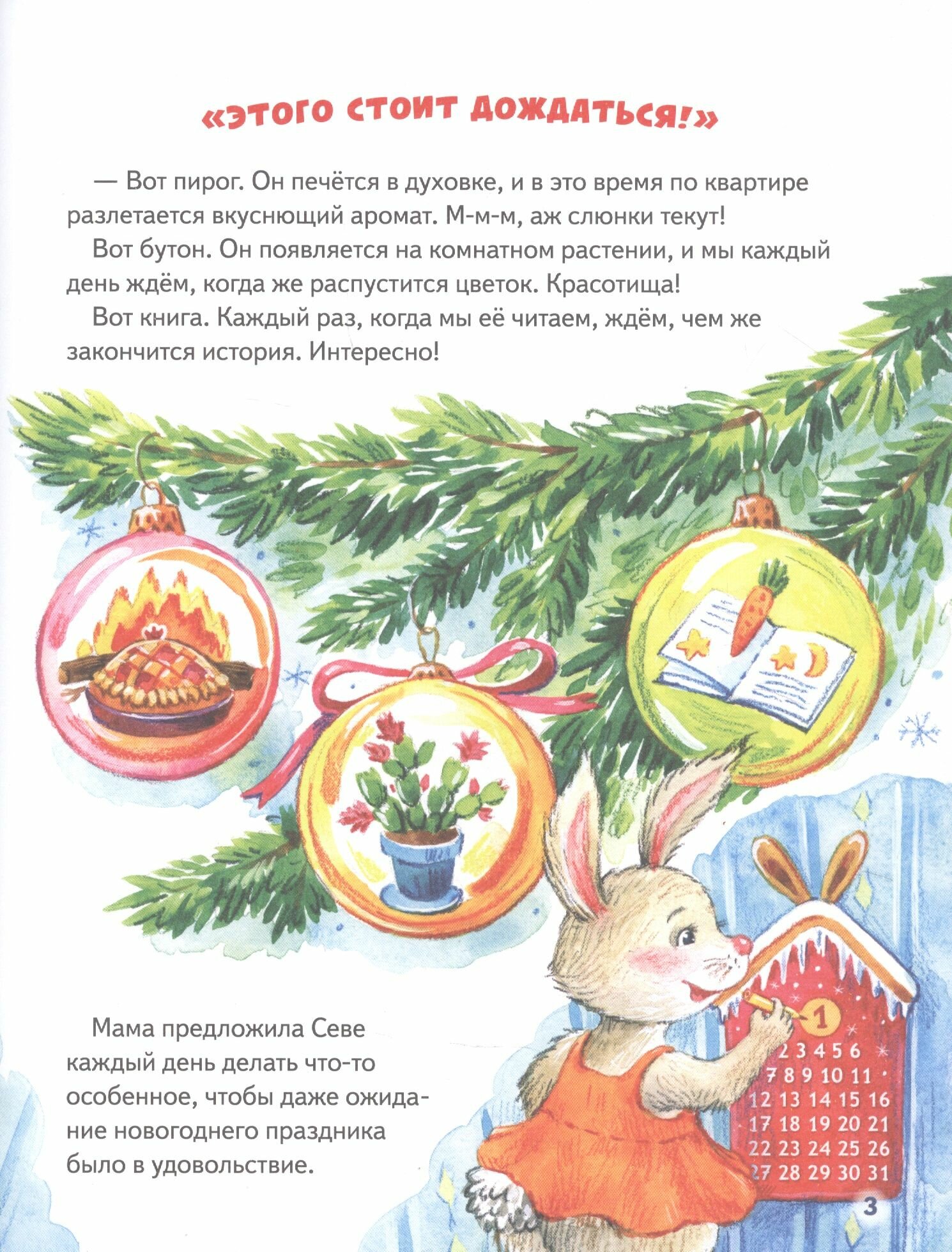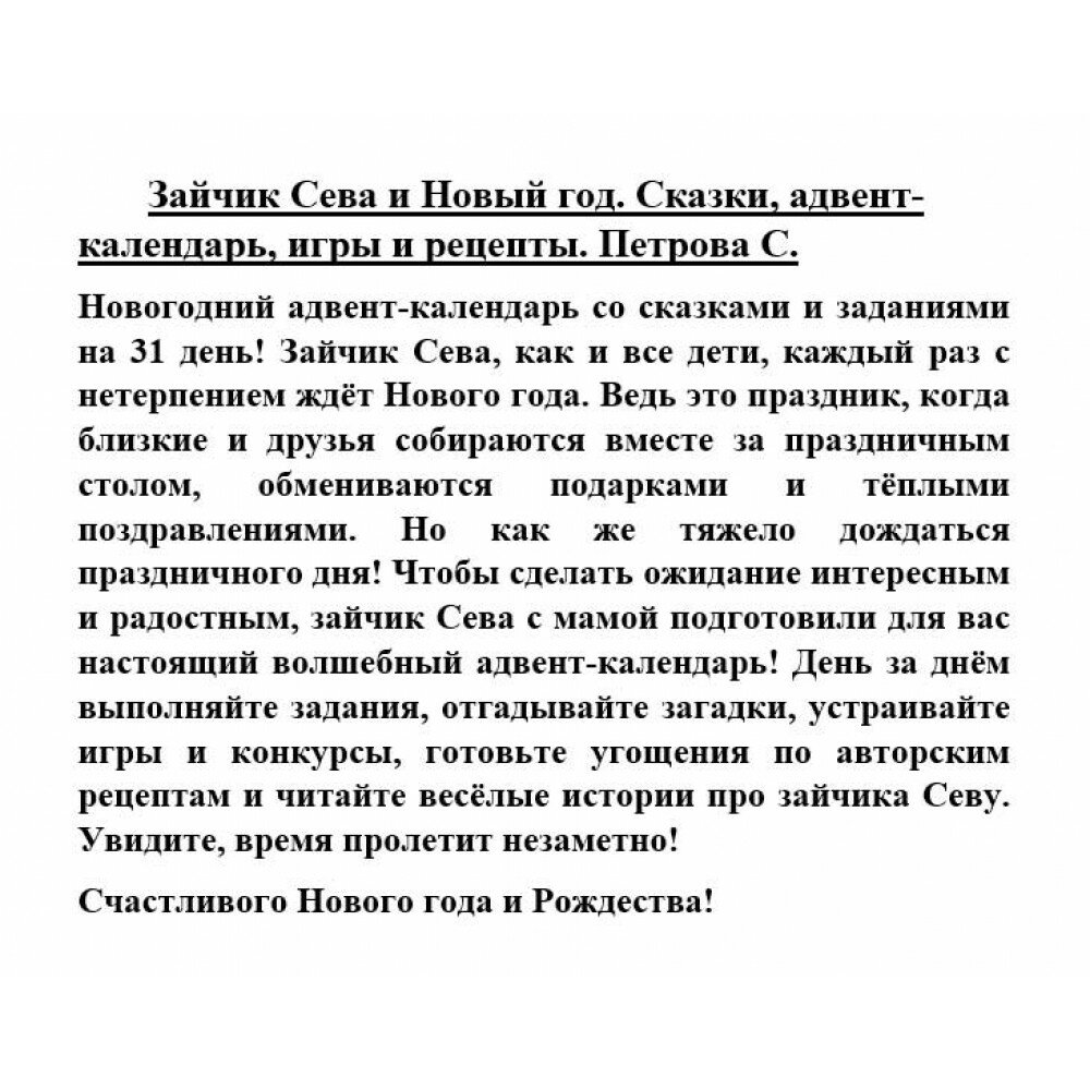 Новогодний адвент-календарь со сказками и заданиями на 31 день! Зайчик Сева, как и все дети, каждый раз с нетерпением ждёт Нового года. Ведь это праздник, когда близкие и друзья собираются вместе за праздничным столом, обмениваются подарками и тёплыми поздравлениями. Но как же тяжело дождаться праздничного дня! Чтобы сделать ожидание интересным и радостным, зайчик Сева с мамой подготовили для вас настоящий волшебный адвент-календарь! День за днём выполняйте задания, отгадывайте загадки, устраивайте игры и конкурсы, готовьте угощения по авторским рецептам и читайте весёлые истории про зайчика Севу. Увидите, время пролетит незаметно!