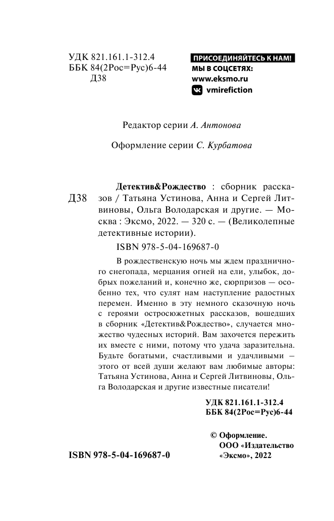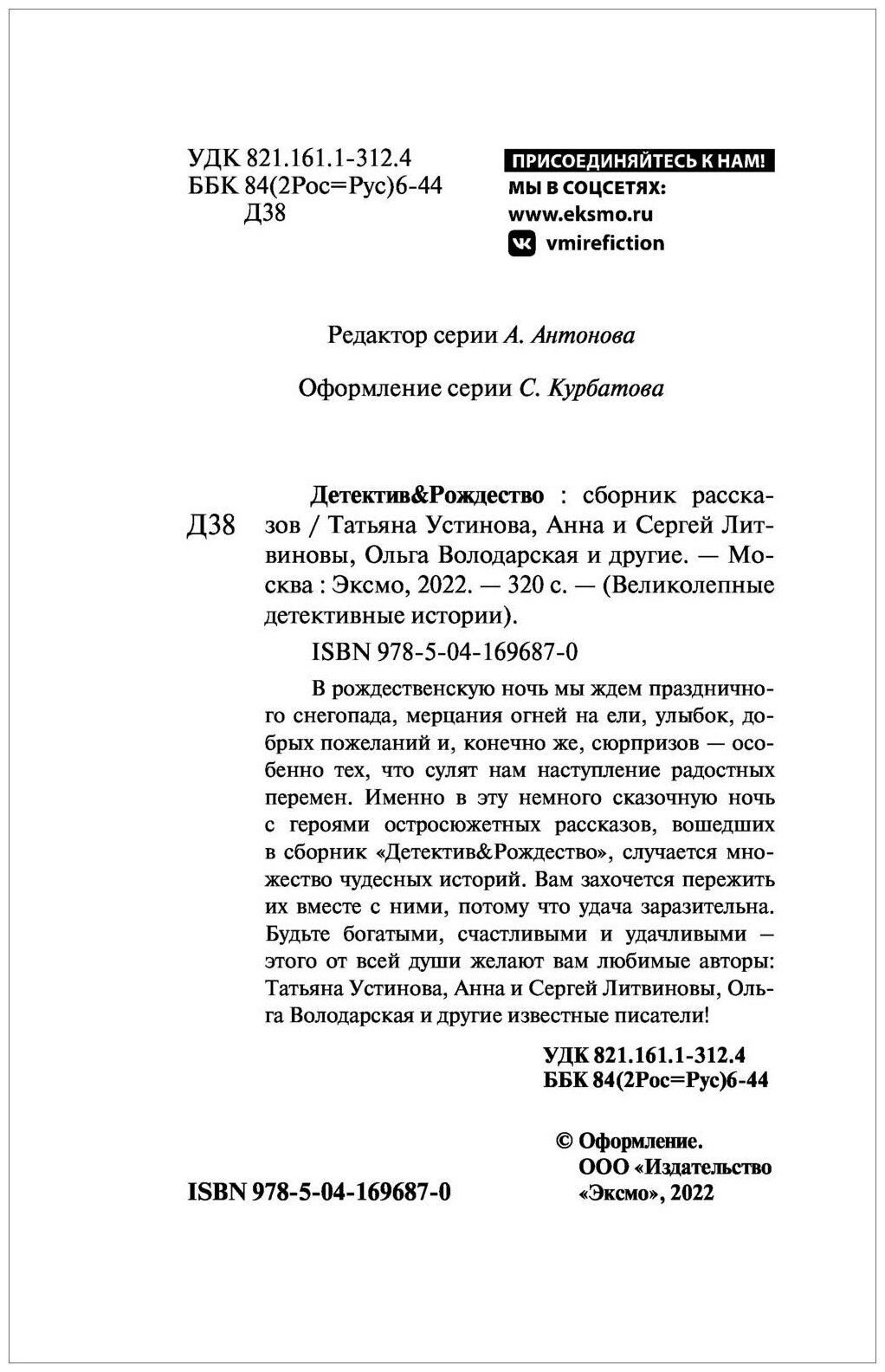 Книга: Детектив&Рождество (Литвиновы Анна и Сергей (соавтор), Володарская Ольга Геннадьевна (соавтор), Устинова Татьяна Витальевна (соавтор), Логунова Елена Ивановна); Эксмо, 2022