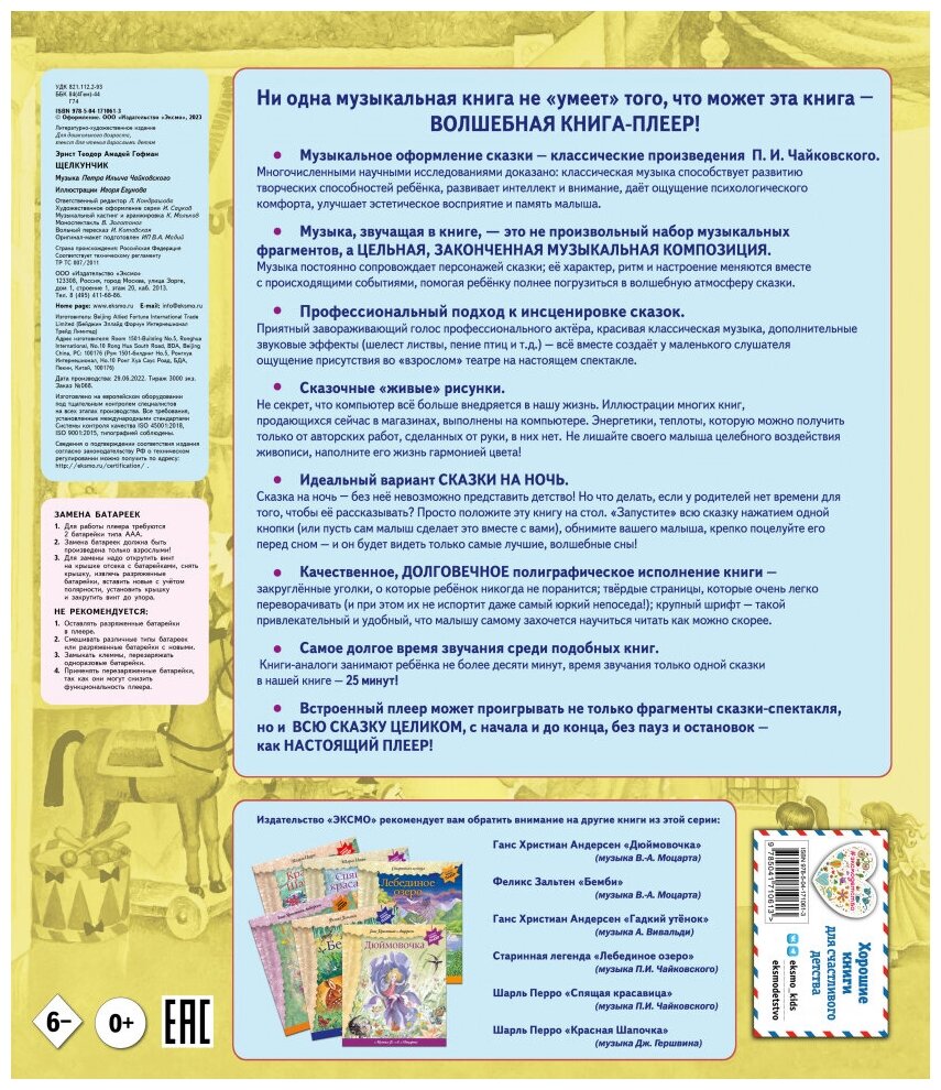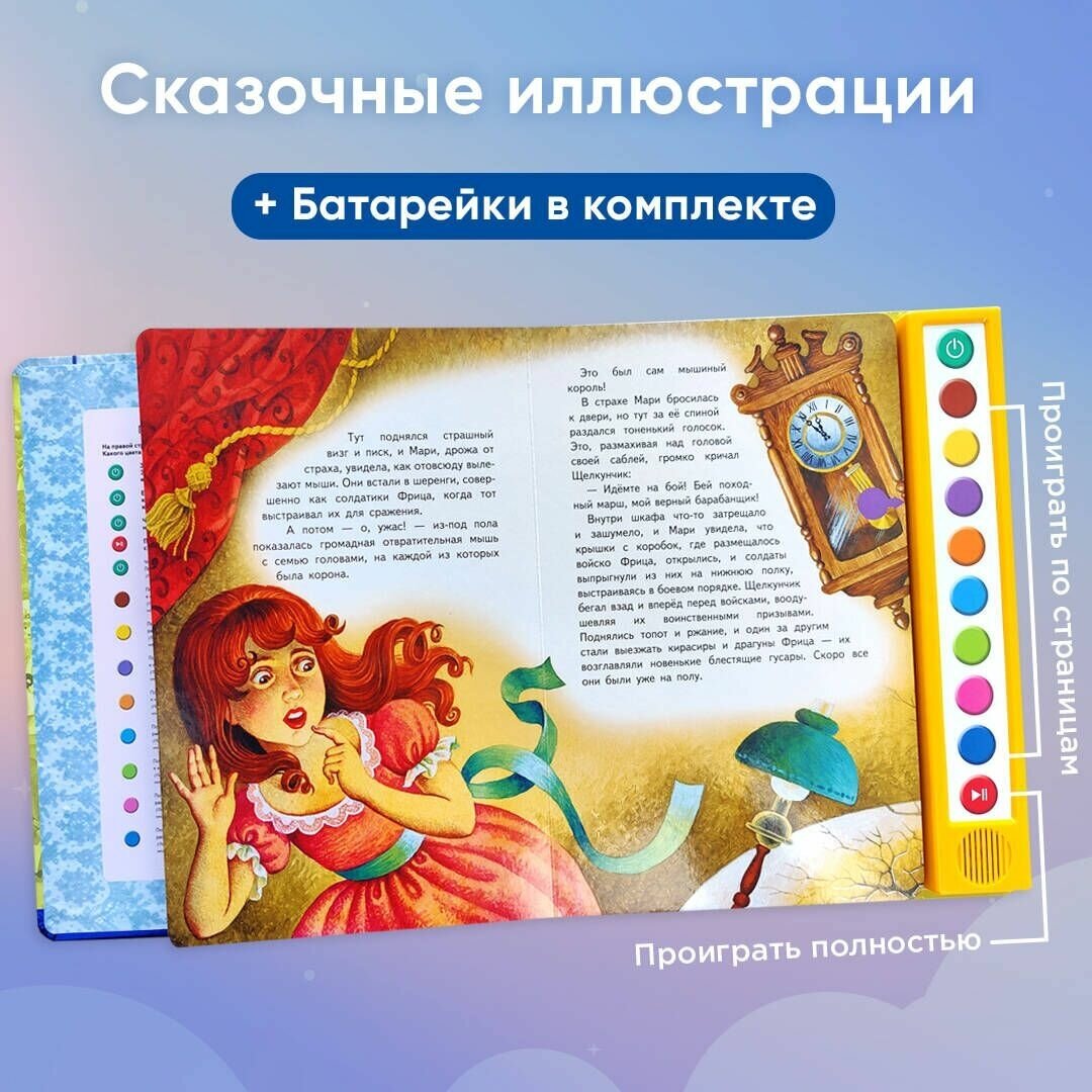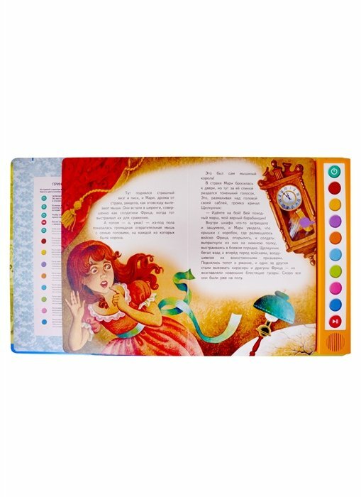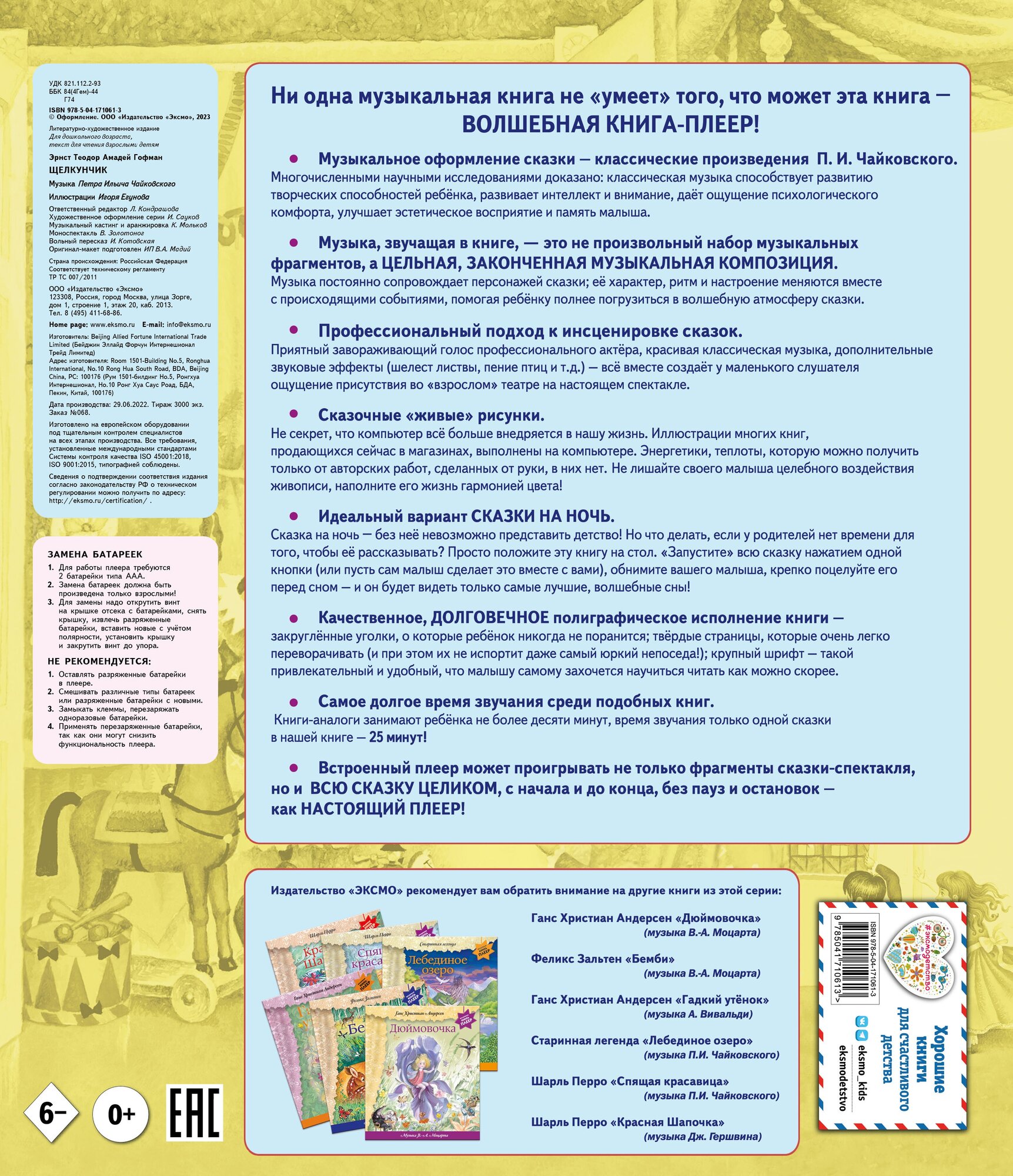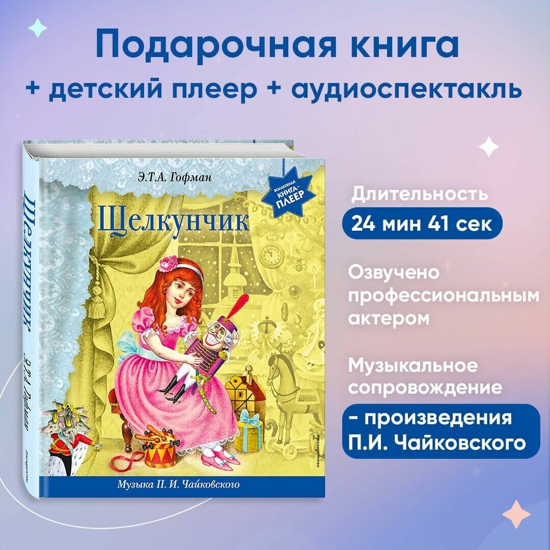 Книга стоит недешево, но цена абсолютно оправдана. Потому что, кроме чтения и наслаждения прекрасными иллюстрациями, ребенок (и взрослый, с еще бОльшим удовольствием))) может послушать музыку из балета Чайковского, написанного по этой книге. Эту интересную серию - "Волшебная книга-плеер (с батарейками)" придумало и реализует издательство ЭКСМО, за что ему большое спасибо. Волшебная сказка Гофмана стала еще волшебнее. Отмечу высочайшее качество изготовления книги - обложка, блок, дизайн и иллюстрации - все супер!
