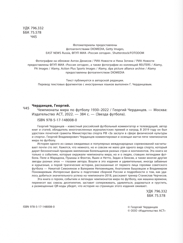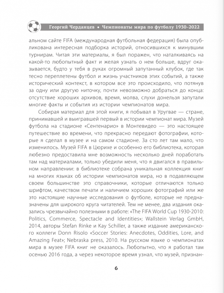 Данное издание известного комментатора и журналиста Георгия Черданцева получилось довольно качественным и интересным. В этой книге автор простым и доступным языком рассказал про исторические эпохи чемпионатов мира по футболу. Текст книги небанальный и сухой, а легкий и моментами юмористический. Кроме того в книге есть куар коды для просмотра видео с историческими матчами. Прочитал очень быстро за неделю. Было приятно ознакомиться накануне футбольного форума.