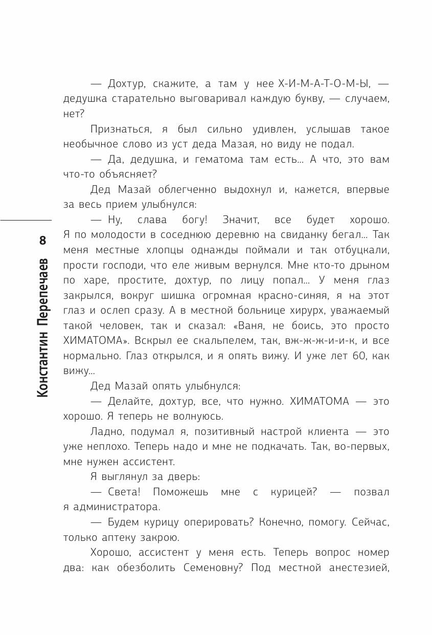 Константин Перепечаев не профессиональный писатель. Прежде всего, он – ветеринар и доктор биологических наук. Профессионализм, юмор и любовь к животным – все это переплетается в сборнике рассказов и создает живой образ паренька, так хотевшего стать кем-то значимым. Это целая история о жизни и ветеринарной практике: непростые 90-е годы, поступление в институт, первые встречи с пушистыми пациентами Он с улыбкой вспоминает встречи, забавные и трогательные случаи и, конечно же, животных, которые обладают своим характером и за чьим поведением так интересно наблюдать.
