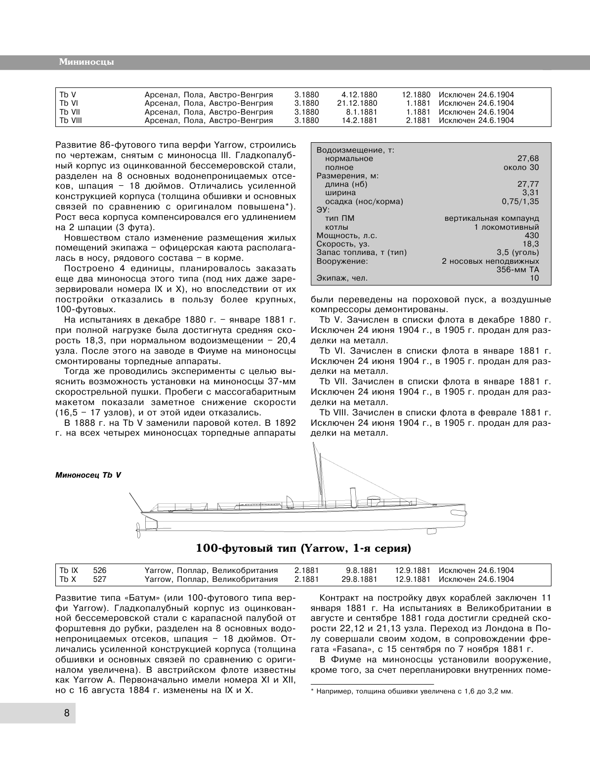 В 1873 г. известная английская фирма Джона Торникрофта построила для ВМС Норвегии первый в мире корабль-носитель минного оружия. Миноносец "Rapp" нес шестовую мину, впоследствии замененную на торпедный аппарат. Спустя пять лет была проведена первая в мировой истории успешная торпедная атака (во время Русско-турецкой войны минные катера Черноморского флота "Чесма" и "Наварин" потопили военный пароход "Интибах"), а миноносцы получили славу настоящего "чудо-оружия" конца XIX столетия.