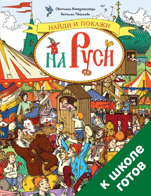 Книга «Найди и покажи на Руси» — издание огромного формата с плотными страницами и пухлой обложкой, украшенной фольгой двух цветов. На каждом развороте — детальные реалистичные иллюстрации и интересные сведения.