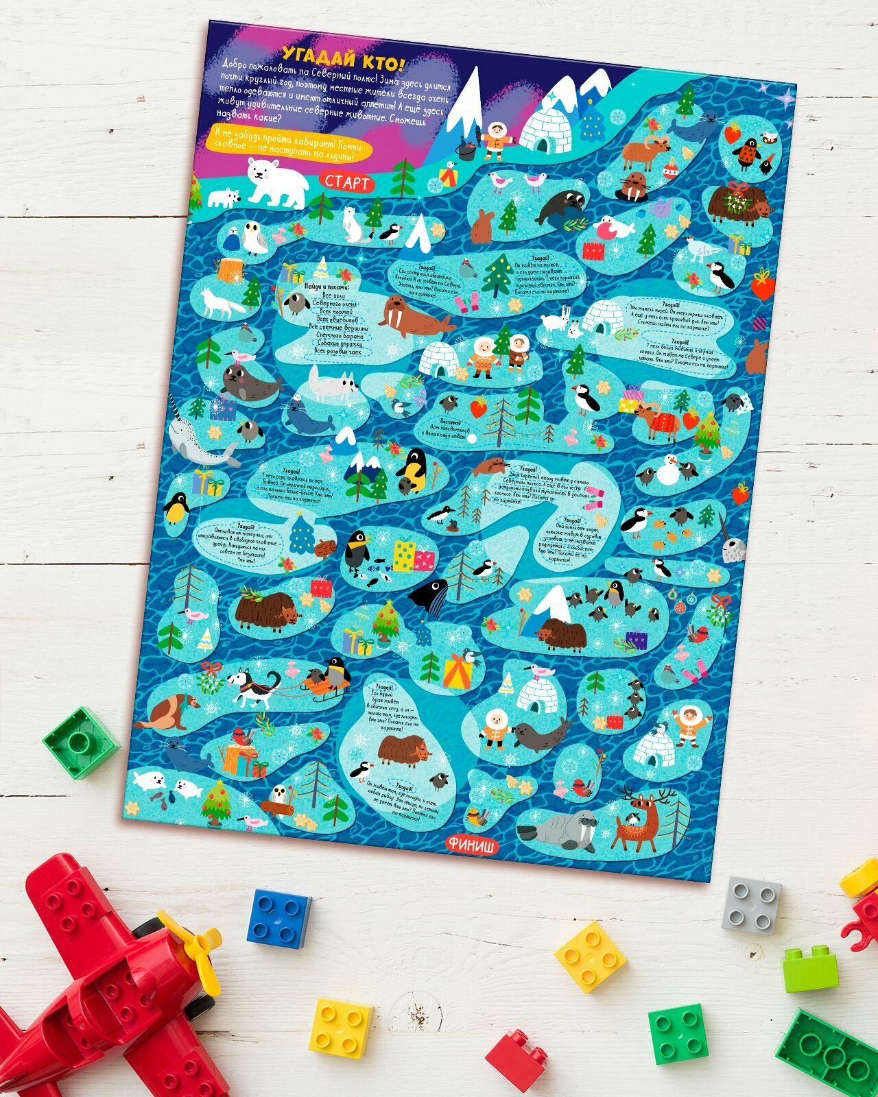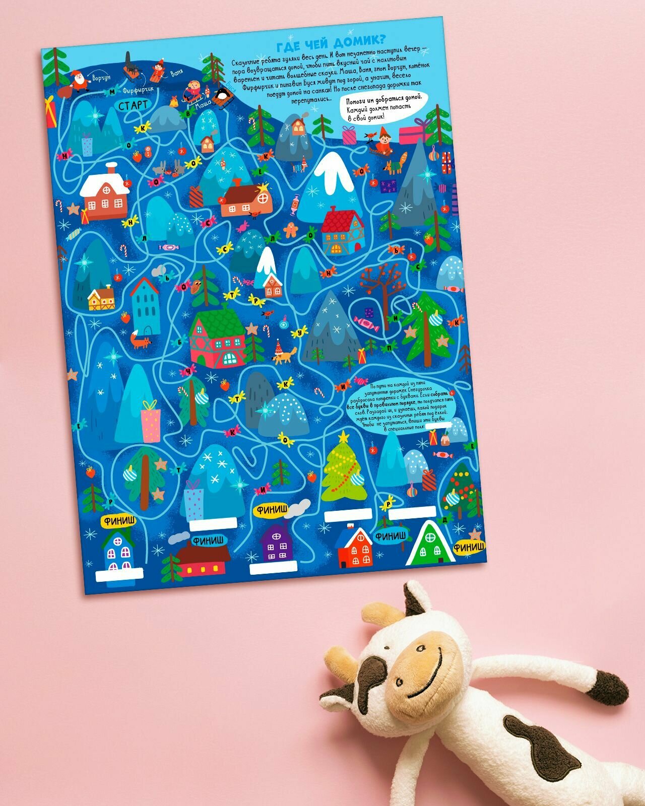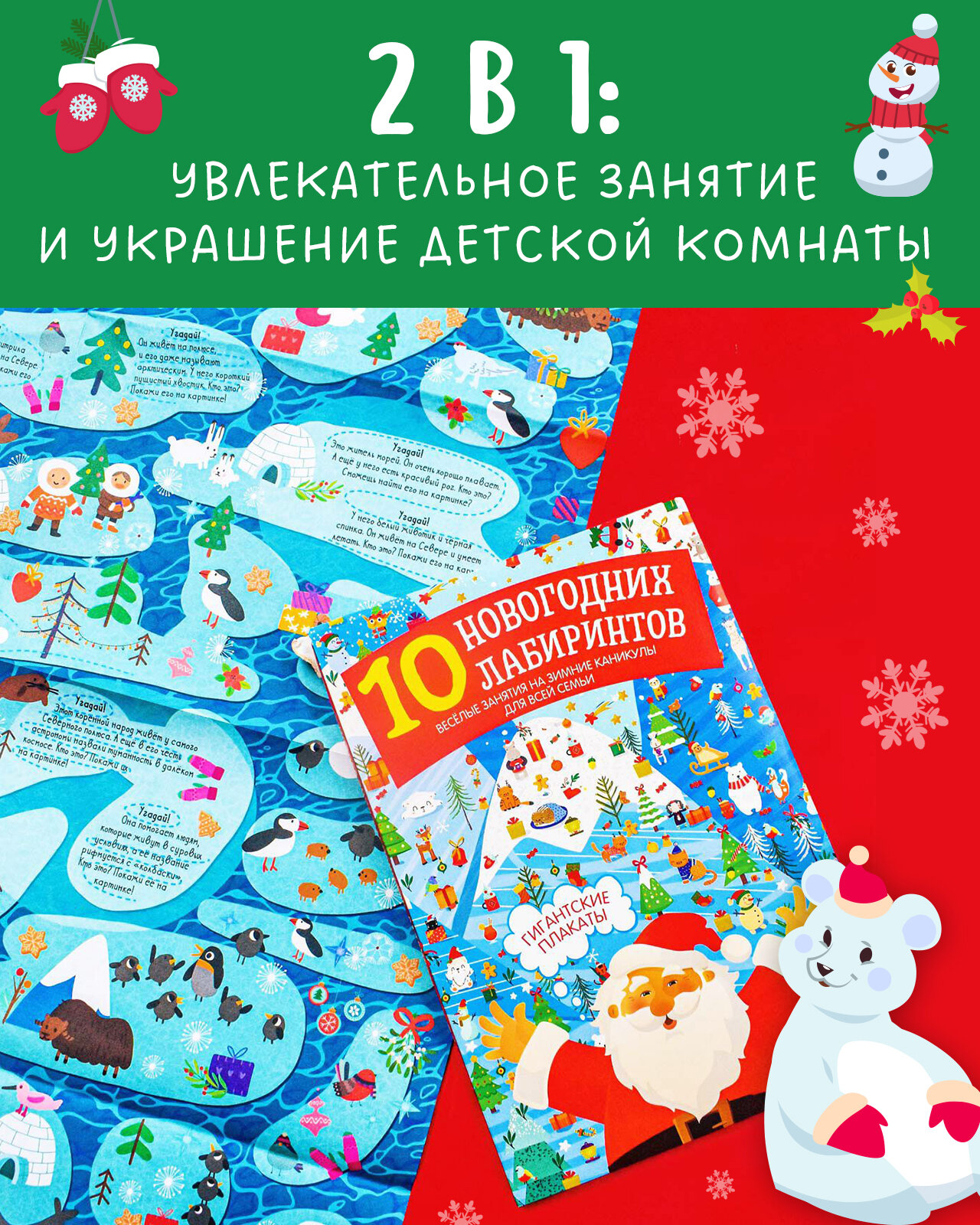 - Практичный формат: 8 игровых постеров, где есть новогодняя история, веселые задания, милые персонажи, запутанный лабиринт.