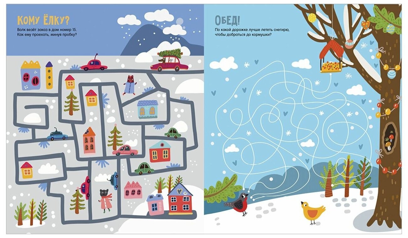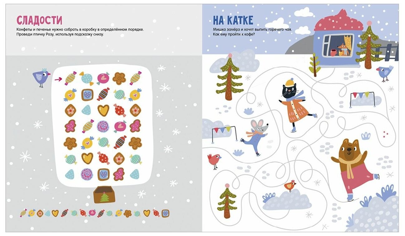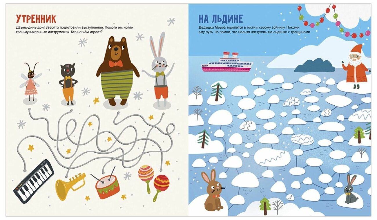 На страницах ждут настоящие зимние приключения: покататься на лыжах с пингвинами, прогуляться по заснеженному лесу, найти выход из ледяных лабиринтов, добраться до подарков Деда Мороза и много чего еще.