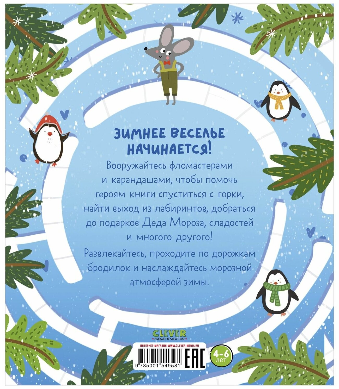 «Дед Мороз, подарки и настоящие зимние приключения ждут на страницах этой книжки! Десятки снежных лабиринтов подарят вашему ребенку праздничное настроение и много часов увлекательных игр», — редактор Clever.
