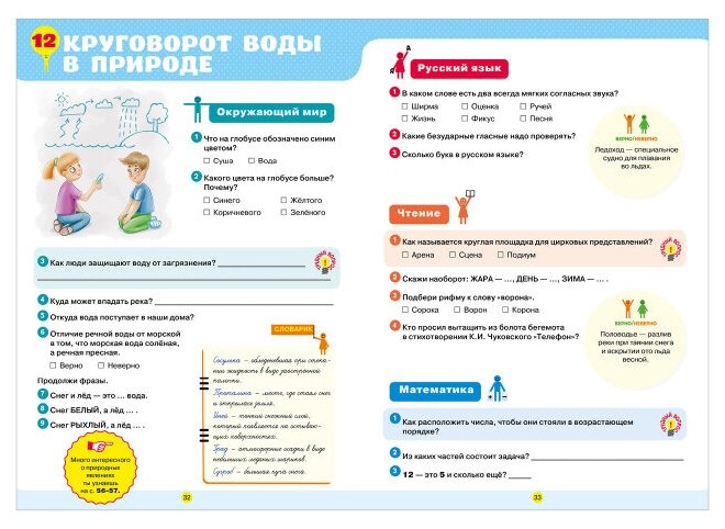 В книге есть все, чтобы первоклассник заполнил пробелы в знаниях, повторил пройденное, расширил кругозор и подготовился к олимпиадам и контрольным. Страницы-помощники подскажут основные правила по русскому языку, математике и важные понятия по окружающему миру. А тестовые задания и интеллектуальные врезки «Викторина», «Кто лишний? Что лишнее?», «Кто такой? Что такое?», «Верно/Неверно» потренируют сообразительность, память и логическое мышление ребенка.