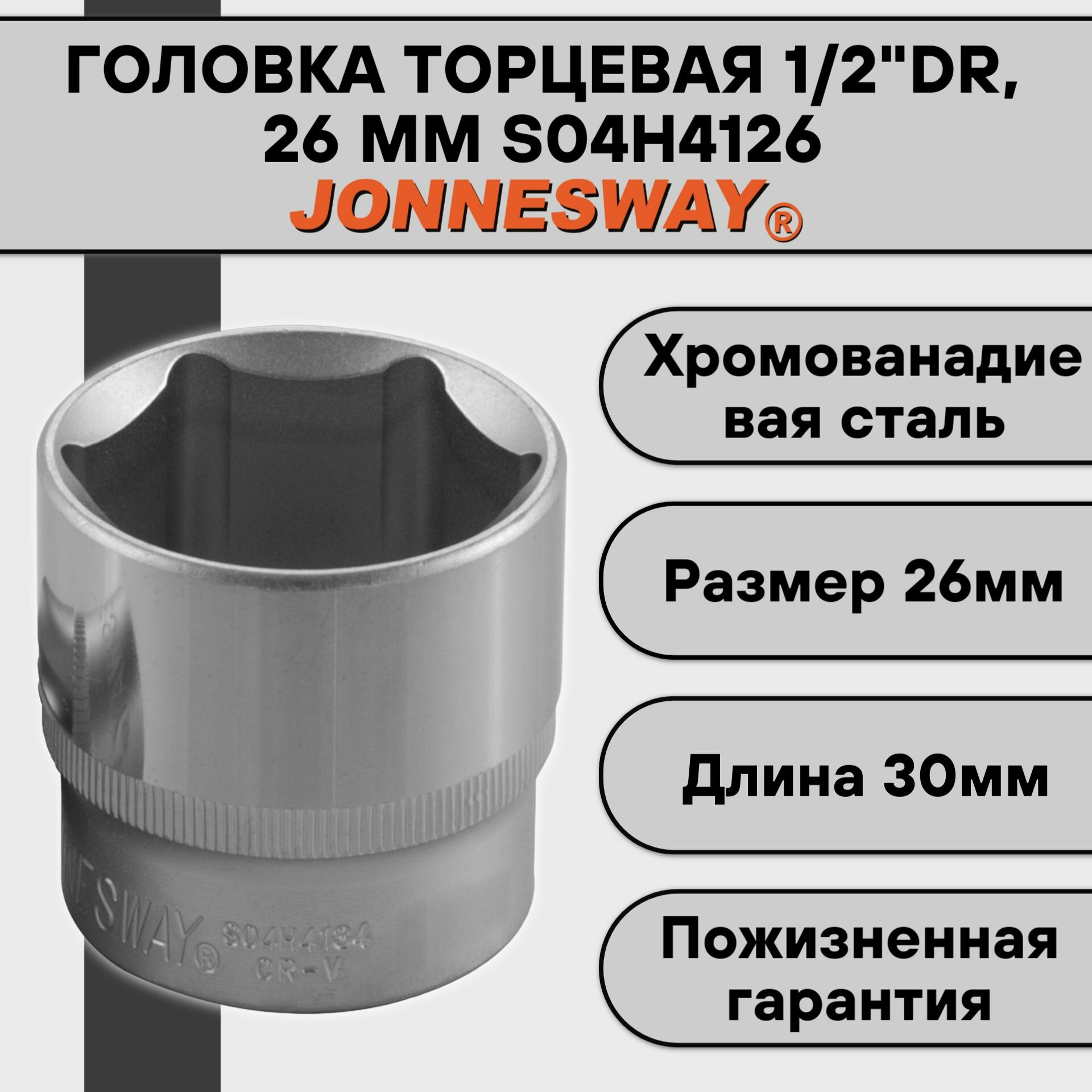 Головка торцевая 1/2"DR, 26 мм Jonnesway относится к группе торцевые головки разделяющиеся по геометрии рабочего профиля, по длине и по назначению. Такие инструменты обеспечивают наилучшие условия для приложения рабочего усилия по сравнению с другими видами инструмента для работы с внешними рабочими профилями.