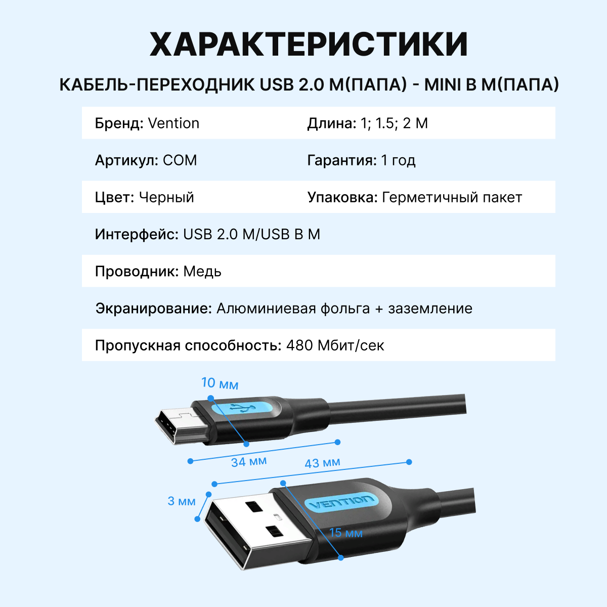 | Разъемы | USB 2.0 A(m) - mini USB B (m) |