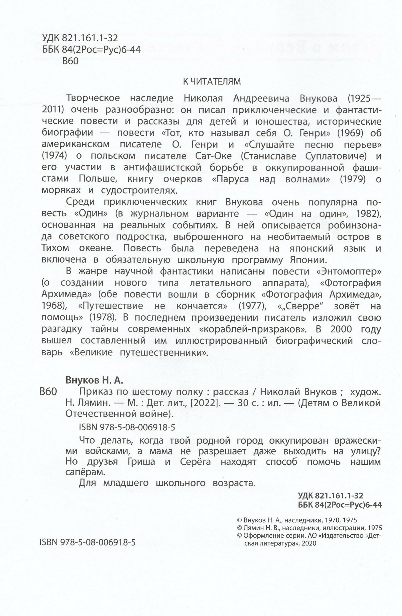 Сервис сравнения цен СкидкаГИД предлагает сравнить цены на товар «Книга: Приказ по шестому полку (Детям о Великой Отечественной войне); Детская литература, 2022»