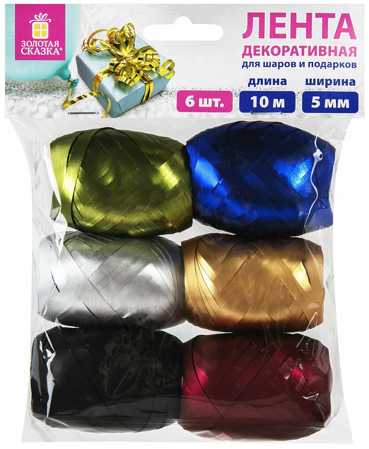 Лента упаковочная декоративная для подарков, матовый металл, 6 шт., 5 мм х 10 м, цвета ассорти, ЗОЛОТАЯ СКАЗКА, 591831. Продается набором по (4 шт.) Набор лент декоративных ЗОЛОТАЯ СКАЗКА предназначен для декорирования подарков, для завязывания воздушных шаров и гирлянд, для оформления праздничных композиций, кондитерских наборов. Ленты также широко используются во флористике и в рукоделии. Набор состоит из 6-ти лент шириной 5 мм и длиной 10 м каждая. Ленты изготовлены из прочного полипропилена (70%), полиэтилена (15%) и полиэтилентерефталата (15%). Толщина лент 130 мкм (0,13 мм). Ленты представлены в шести цветах с эффектом матовый металлик: оливковый, синий, серебристый, бронзовый, черный, бордовый. Ленты упакованы в прозрачный пакет с картонным подвесом, на обратной стороне которого представлена краткая информация о товаре.