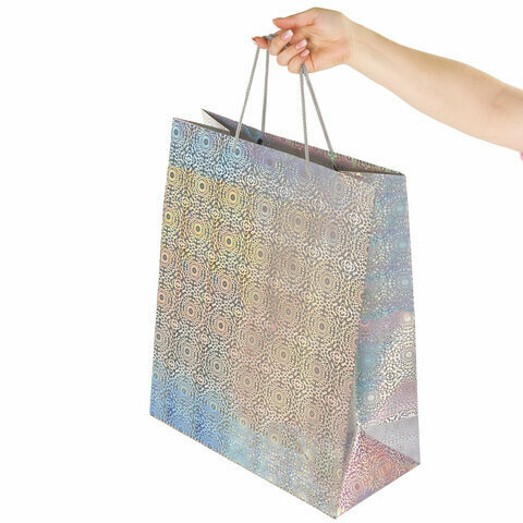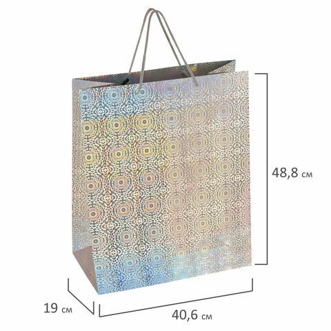 Пакет подарочный 40,6x19x48,8 см, ЗОЛОТАЯ СКАЗКА голография, ассорти 3 цвета, 606611. Продается набором по (12 шт.) Подарочный пакет ЗОЛОТАЯ СКАЗКА - отличное решение для упаковки любого презента, которое позволит с легкостью и со вкусом оформить выбранный подарок. Подарочный пакет, как и все виды подарочной упаковки, способен придать особый статус подарку, также он является достаточно практичным изделием, которое может использоваться в повседневной жизни. Голографический пакет изготовлен из мелованной бумаги с веревочными ручками из полипропилена и представлен в трех цветах и дизайнах. Выполнен в синем, золотистом и серебристом цветах. Размер 40,6x19x48,8 см.