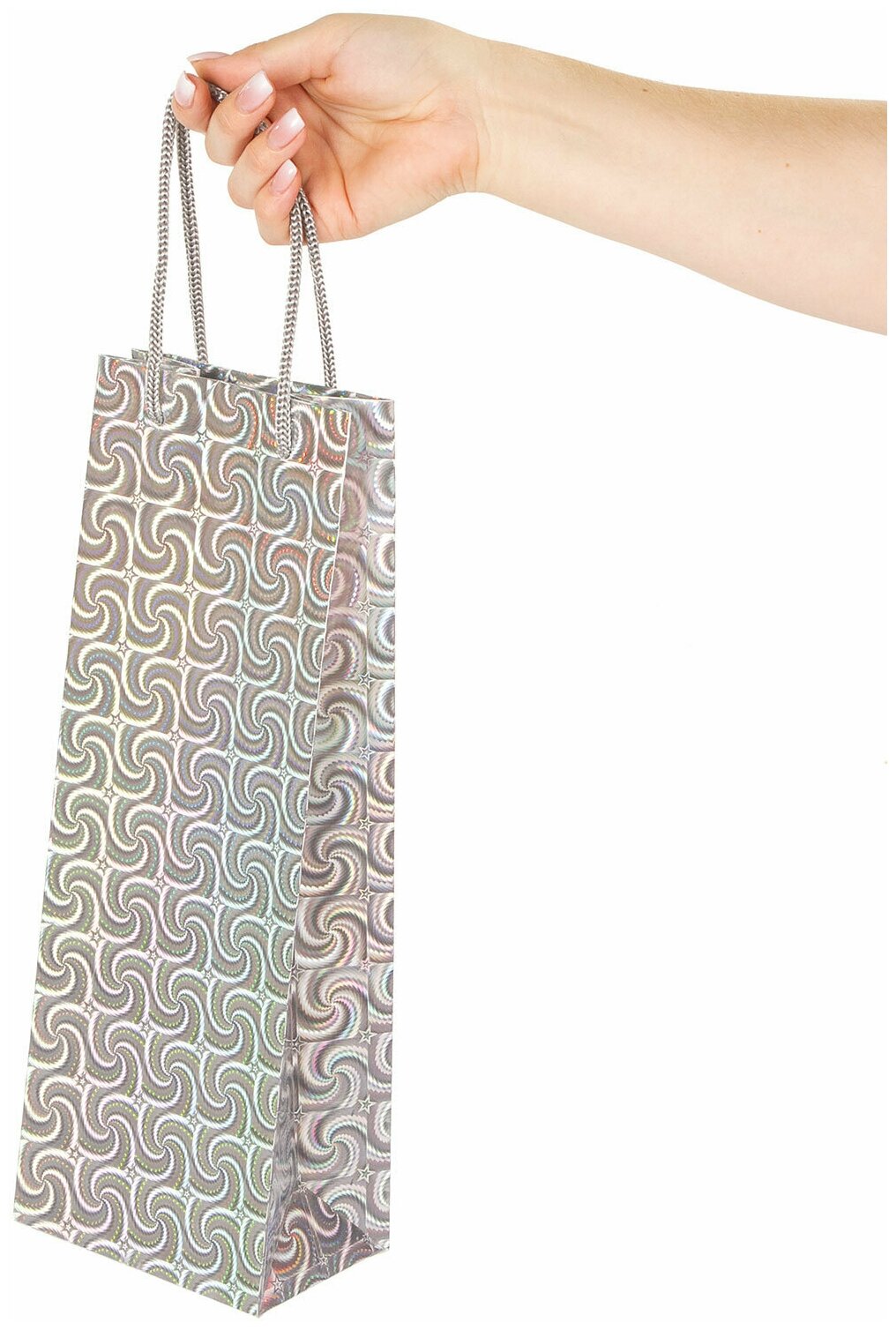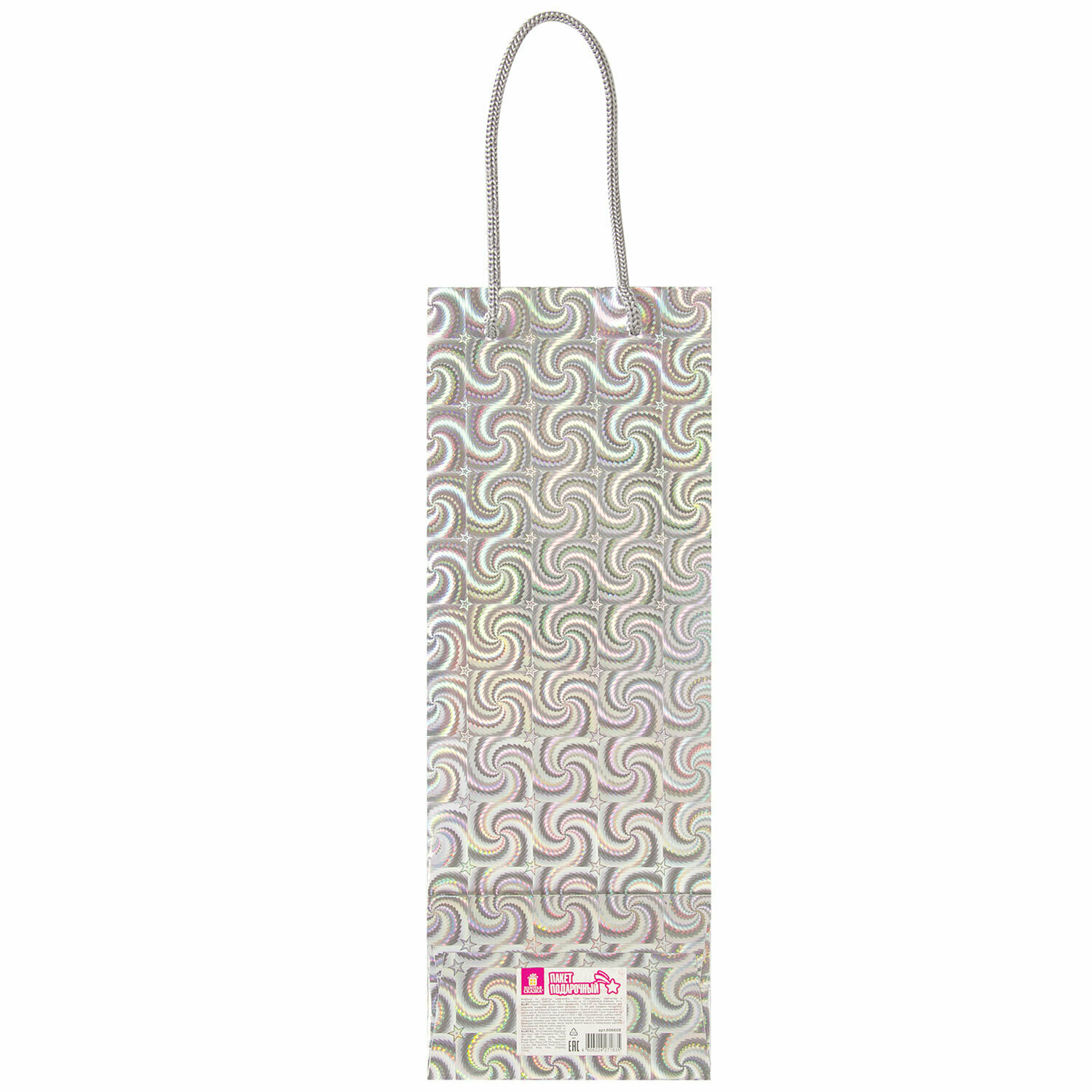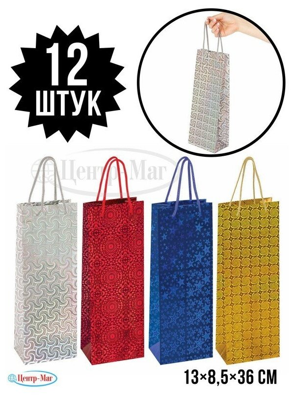Пакет подарочный для бутылки 13x8,5x36 см, ЗОЛОТАЯ СКАЗКА голография, ассорти 4 цвета, . Продается набором по (12 шт.) Подарочный пакет ЗОЛОТАЯ СКАЗКА - отличное решение для упаковки любого презента, которое позволит с легкостью и со вкусом оформить выбранный подарок. Подарочный пакет, как и все виды подарочной упаковки, способен придать особый статус подарку. Бутылочный голографический пакет изготовлен из мелованной бумаги с веревочными ручками из полипропилена и представлен в четырех цветах и дизайнах. Выполнен в красном, синем, серебристом и золотистом цветах. Размер 13x8,5x36 см.