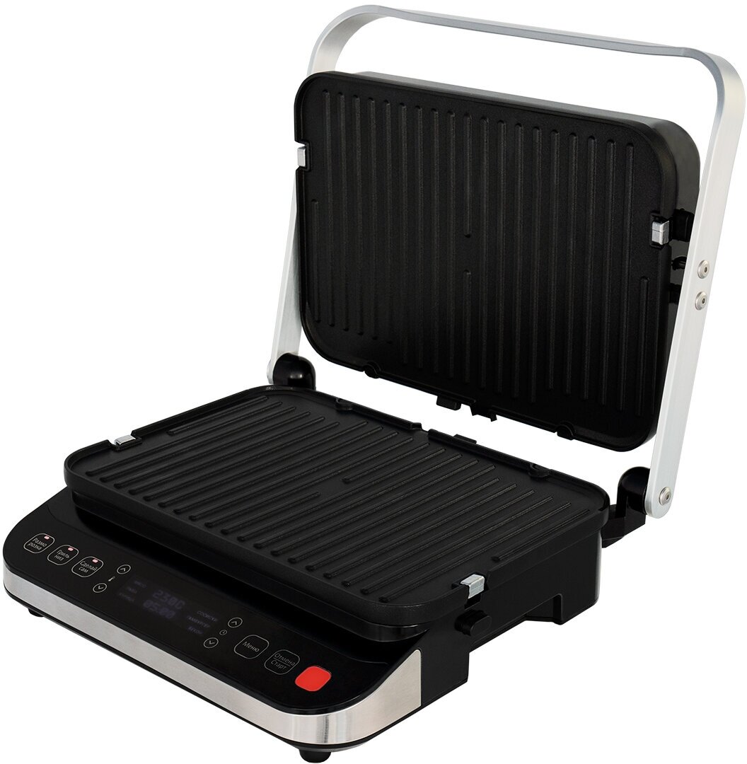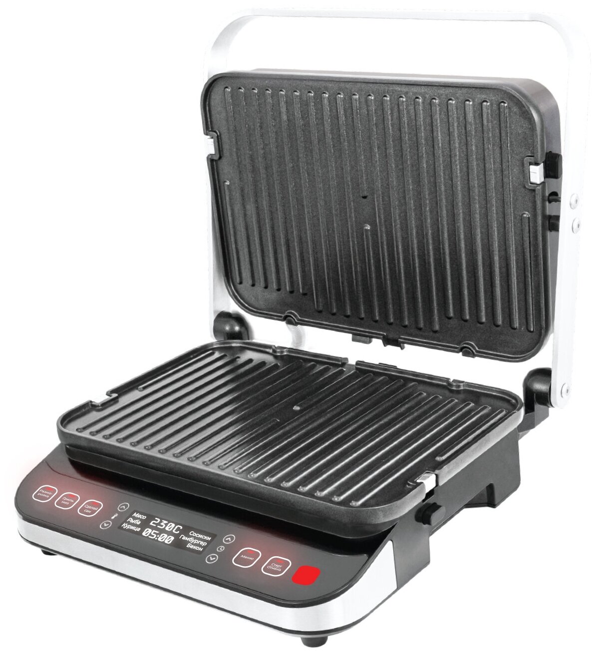 Компактный электрогриль мощностью 2000 Вт с электронным управлением позволяет быстро и качественно приготовить Ваши любимые блюда из мяса, рыбы, овощей с помощью 6 автоматических режимов приготовления, а также расширить свои кулинарные умения с помощью индивидуальных настроек в режиме СДЕЛАЙ САМ (DIY), используя регулировку температуры от 80*С до 230*С и времени приготовления от 30 сек до 60 минут, по Вашему желанию. Приятным дополнением также станет возможность использовать двухсторонние антипригарные пластины: рифленая - подходит для жарки стейков из мяса, рыбы, птицы, котлет, гамбургеров, овощей, а плоская - предназначена для приготовления яичницы, омлета, оладьев, блинов, сэндвичей, тостов, морепродуктов. Комбинируйте стороны пластин по Вашему усмотрению! Вместительный маслоприемник, как и панели, легко снимается для обслуживания и удобен в хранении. Цветовой сенсор индикатор всегда покажет степень готовности продукта, а конструктивная особенность открывания пластин на 180 градусов - позволит превратить Ваш прибор в полноценную жаровню. Рецепты и советы по настройкам в инструкции помогут Вам на начальном этапе познания Ваших кулинарных способностей с использованием гриля.
