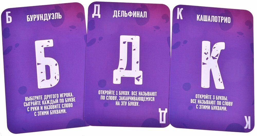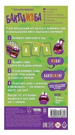 Образец элегантностиДля тех, кто не хочет разбираться в правилах, но хочет немного задействовать свой разум, игра отлично подойдет. Проверяет на прочность ваш словарный запас! Ну и да, игры на избавление от карт, как правило, завязаны на цифрах, а тут на буквах. Приятное разнообразие для тех, кто любит вечериночные игры, но уже несколько разочаровался и все ему приелось. Баклажаба - это то, что мы все заслужили