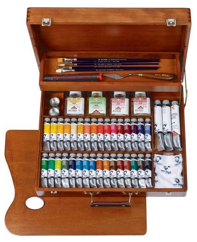 Комплектация набора: в данный набор входит 14 цветов масляной краски Van Gogh в тубах по 40 мл, медиум для масляных красок, уайт-спирит без запаха, плоская кисть №10 из свиной щетины, круглая кисть №6 из свиной щетины, мастихин, уголь (3 шт), двойная масленка, деревянная палитра, салфетка. Набор упакован в подарочный ящик из темного дерева.