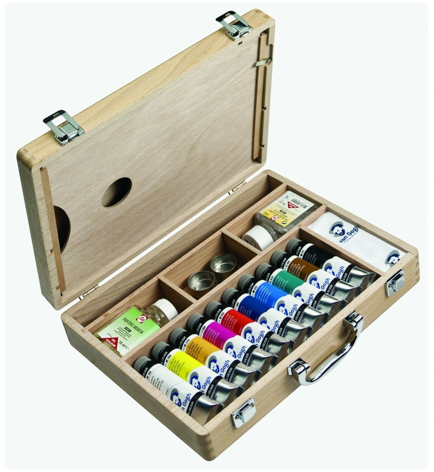 Комплектация набора: в данный набор входит 10 цветов масляной краски Van Gogh в тубах по 40 мл, медиум для масляных красок, уайт-спирит без запаха, плоская кисть №10 из свиной щетины, круглая кисть №6 из свиной щетины, двойная масленка, деревянная палитра, салфетка. Набор упакован в ящик из древесины.