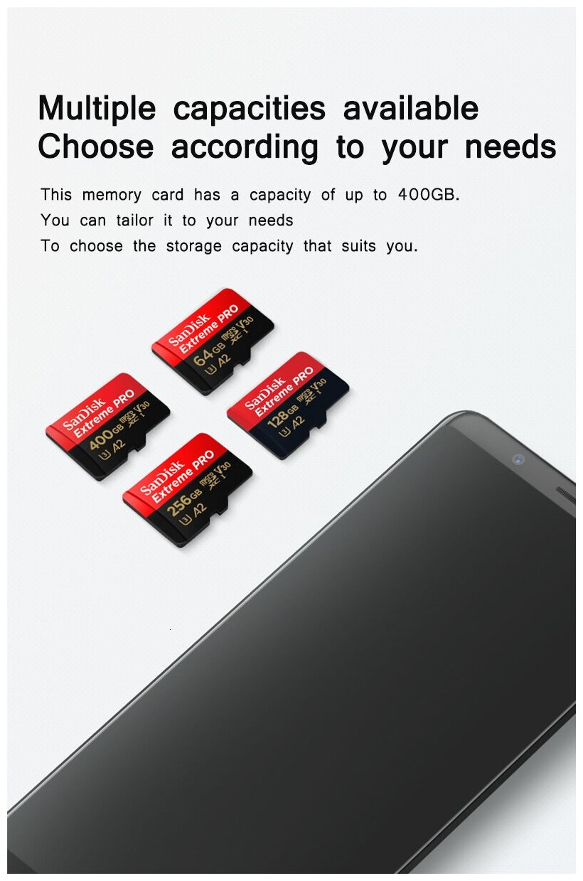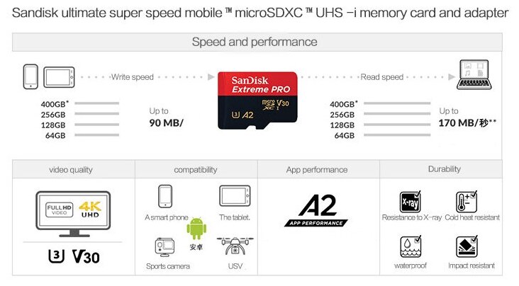 | Описание | Карта памяти microSDXC™ обеспечивает исключительно высокую скорость для быстрой передачи данных, работы приложений и видео в формате 4K UHD.2 Эта высокоскоростная карта Extreme Pro microSD SDXC, идеальная для смартфонов на базе Android™, экшн-камер и дронов, записывает видео в формате 4K UHD, поддерживает видео Full HD и фотографии с высоким разрешением. Сверхбыстрая карта памяти SanDisk Extreme PRO microSDXC™ читает данные со скоростью до 200 МБ/с8 и записывает со скоростью до 140 МБ/с.8Кроме того, она имеет класс скорости A2, благодаря чему приложения будут работать быстрее и пользоваться смартфоном станет еще удобнее.5 |