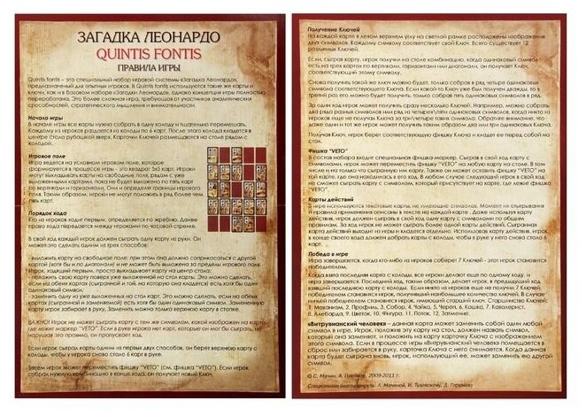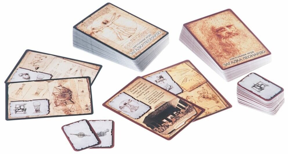 «Загадка Леонардо» - настольная карточная игра-головоломка, участники которой исследуют записи Леонардо да Винчи в поисках скрытых закономерностей. Обнаружив последовательность из трёх одинаковых символов, игрок получает соответствующий ключ. Цель игры - собрать семь разных ключей: тот, кто сделает это первым, раскроет загадку Леонардо и станет победителем.
