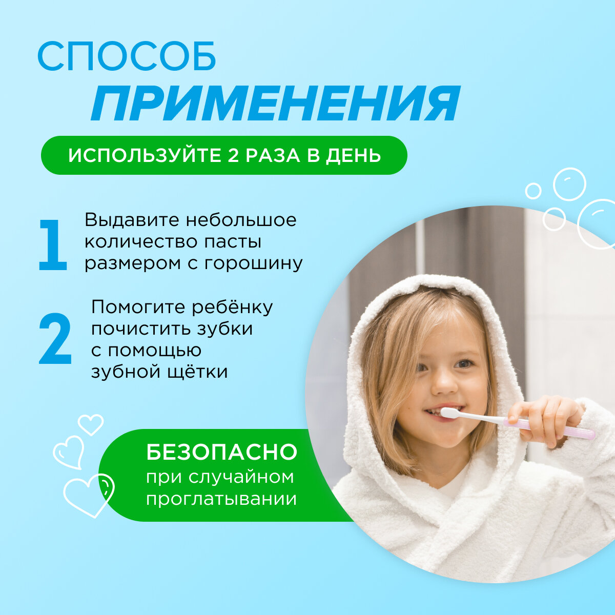 | Способ применения | Для ежедневного применения. Рекомендуется чистить зубы 2 раза в день в присутствии взрослых количеством пасты размером с горошину. Безопасна при случайном проглатывании. |