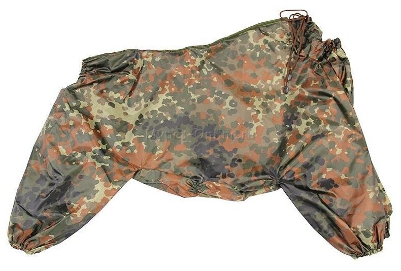 Комбинезон удобно садится по фигуре питомца и не стесняет его движений при прогулке. Изделие надежно фиксируется при помощи липучки на спине, ширина горловины регулируется при помощи завязки, а на штанинах предусмотрены удобные резинки, препятствующие попаданию грязи и влаги снизу.