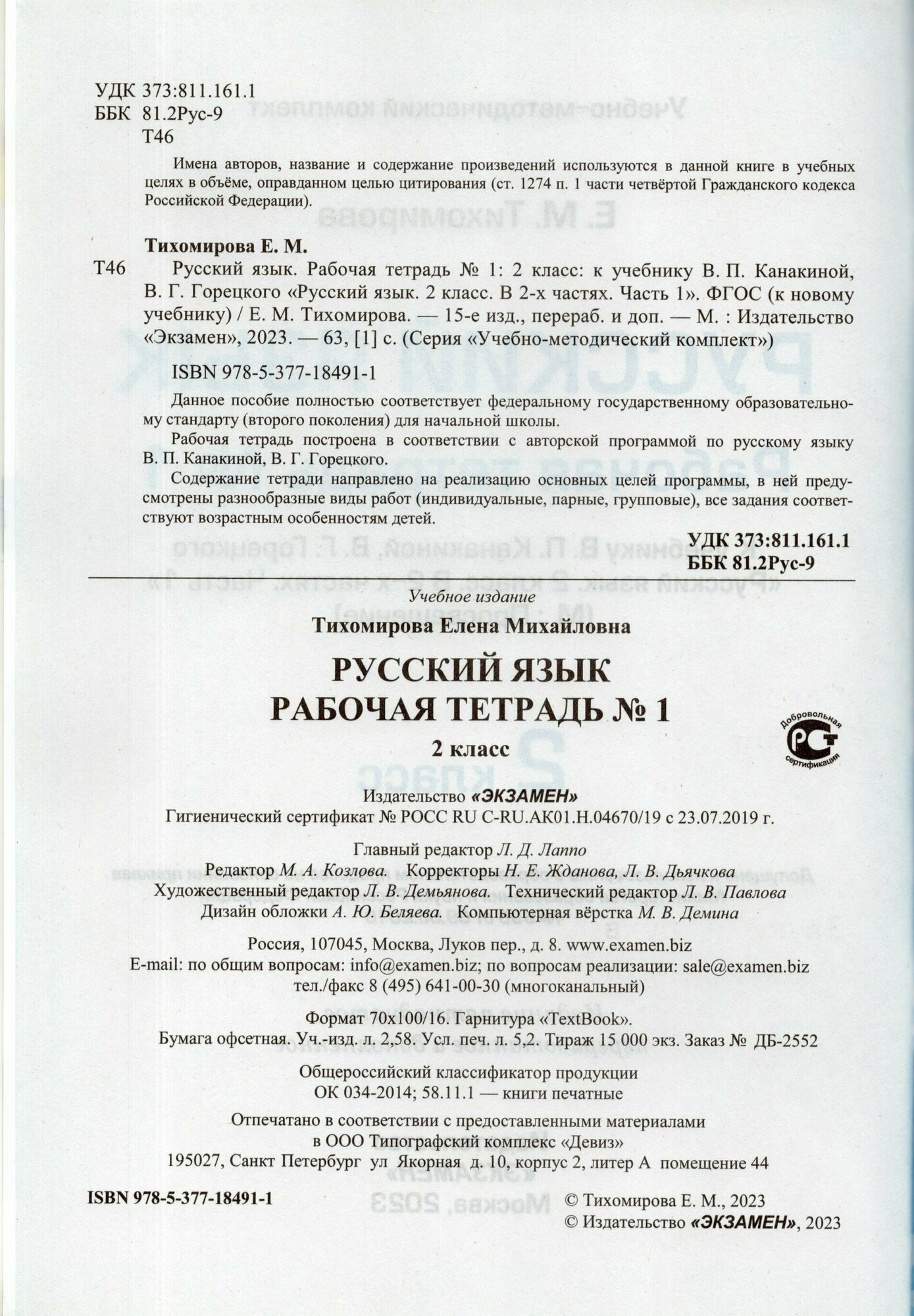 Русский язык 2 класс Рабочая тетрадь 1 К учебнику Канакиной Горецкого Русский язык 2 класс В 2-х частях Часть 1 М Просвещение (Тихомирова Елена Михайловна); Экзамен, 2023