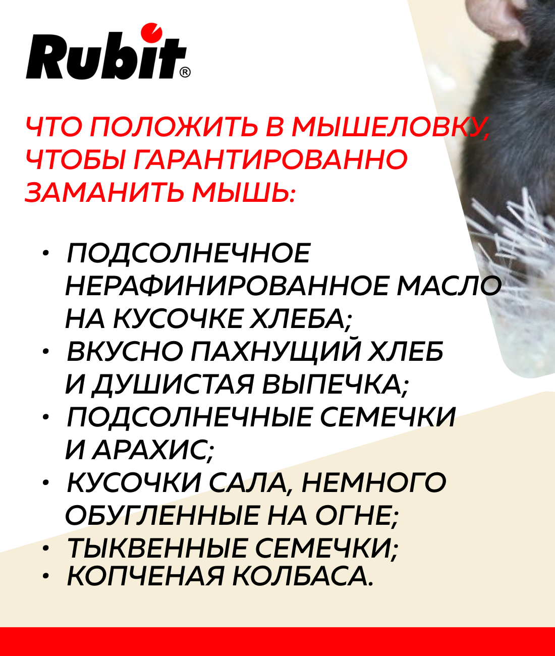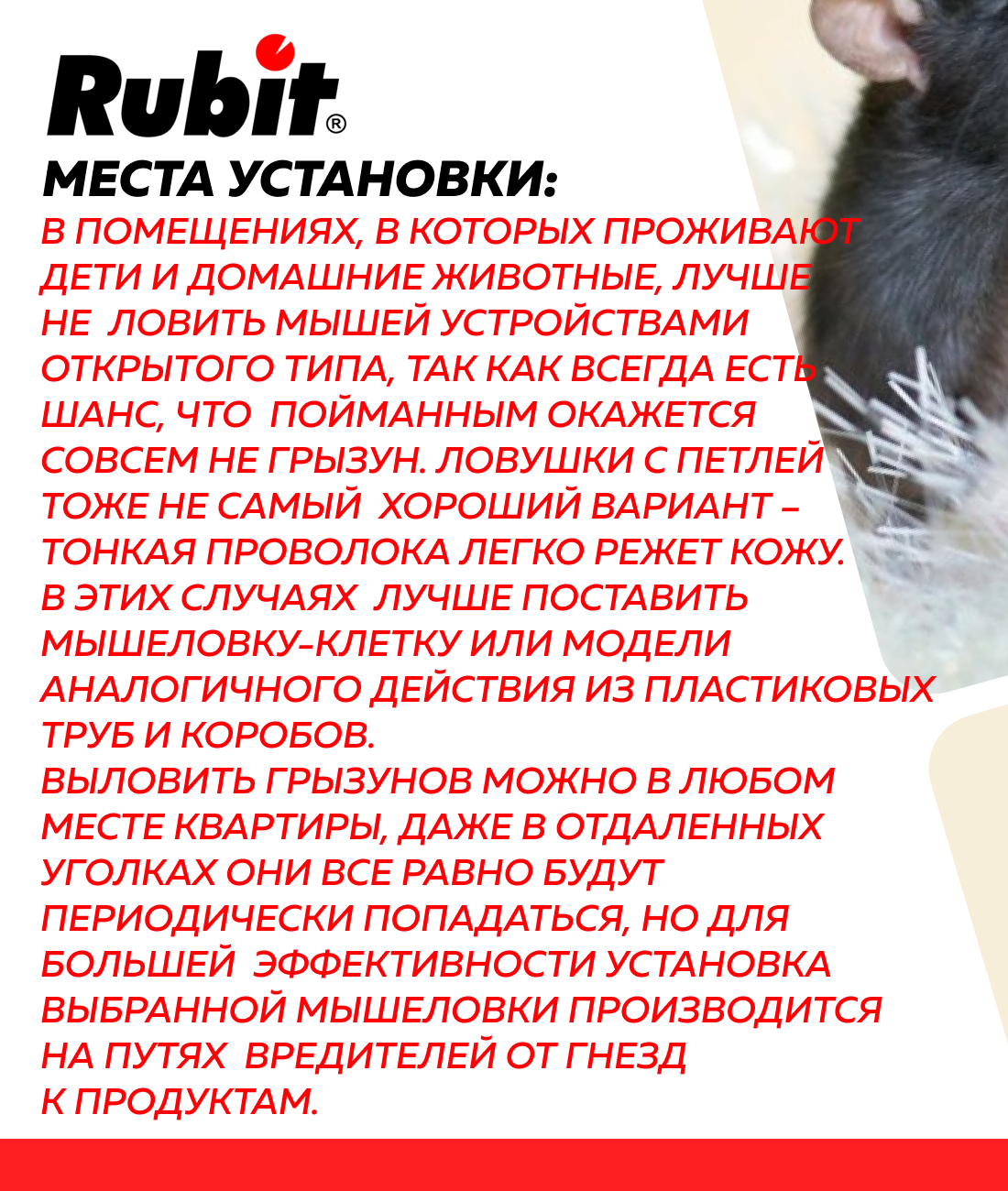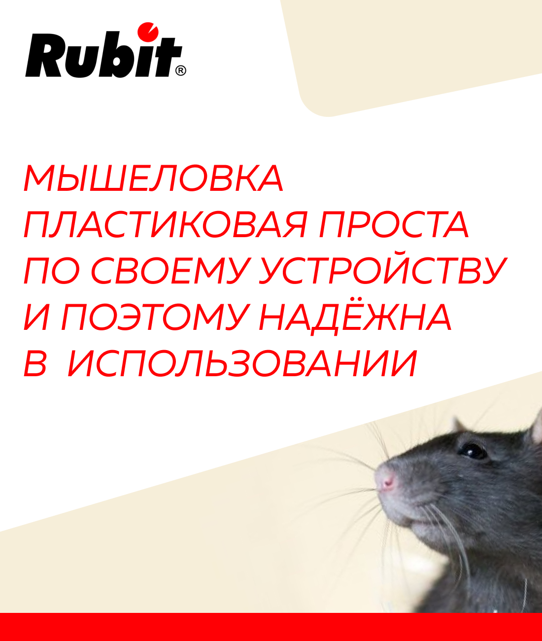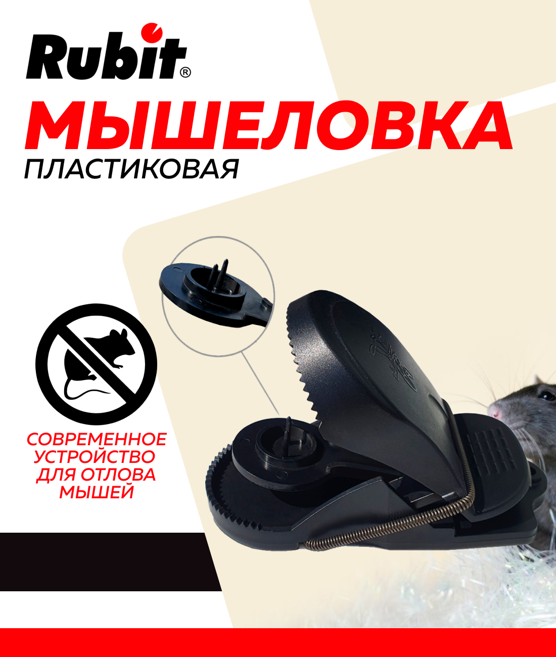 **Мышеловка Рубит** предназначена для борьбы с грызунами в жилых и общественных помещениях, подвалах, погребах. Оснащена захлопывающимся механизмом.