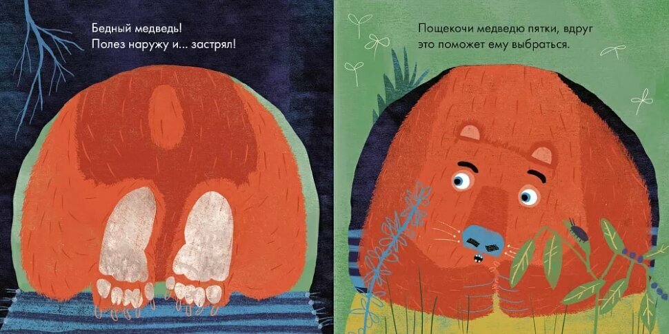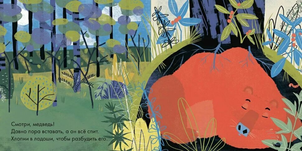 Чудо-книжка! Купила для младшей дочки и не прогадала. Вообще сейчас вроде много книжек-картонок, но в основном они мне не очень нравятся. А эта отличная. Очень нравится рисовка, цвета, такая она уютная. И сам подход классный - она интерактивная. Дочка с большим энтузиазмом взаимодействует с книжкой! Здороваемся с медведем, даём ему пять, болтаем с ним, успокаиваем, хвалим, укладываем спать. И сами укладываемся при этом :)) Разворот с зевком - любимый (мой)). Дочка любит пяточки медведю щекотать, чтобы он из берлоги смог вылезти. Советую! Книжка не на один раз, мы уже какое-то время её просматриваем почти каждый день и не надоедает. Ещё можно дополнять историю самостоятельно.