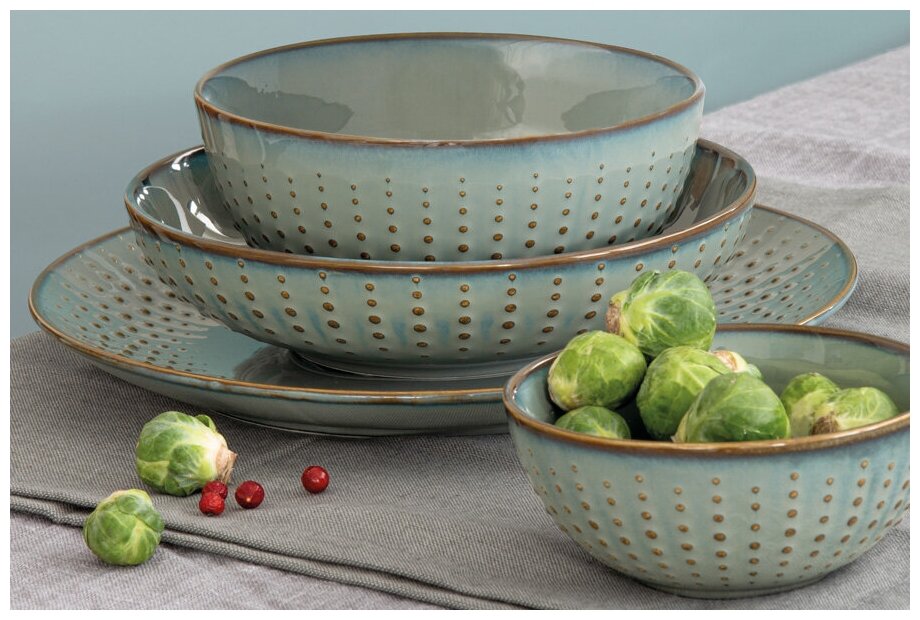 Коллекция Drops от компании Easy Life представлена оригинальными блюдами, тарелками, салатниками, кружками, заварочными чайниками, чашками с блюдцами, а также другой столовой посудой из прочного глазурованного фарфора белого или серо-зеленого цвета. Предметы имеют простые классические формы и уникальный рельефный декор в виде радиально расположенных линий, которые состоят из контрастных коричневых точек, напоминающих капельки дождя и придающих образу особое очарование. Дизайн серии сочетает в себе лаконичность, необычное исполнение и самобытный стиль, что делает посуду Drops идеальным вариантом для повседневной сервировки стола. Изделия прекрасно сочетаются с посудой других оттенков, что позволяет создавать разнообразные сервировочные композиции на свой вкус. Можно использовать в микроволновой печи и мыть в посудомоечной машине.
