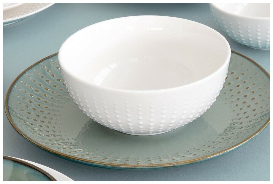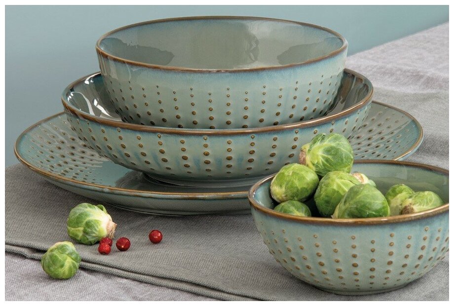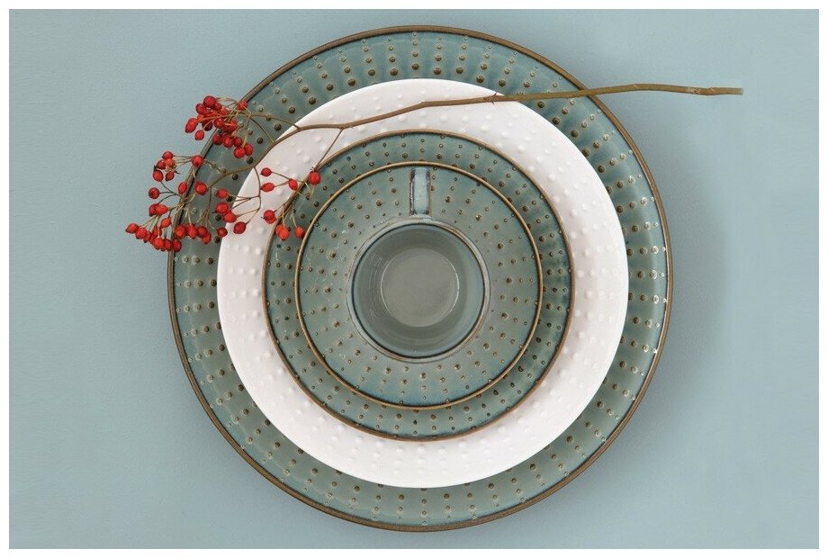 Коллекция Drops (Капли) представлена в двух цветах - белом и сером (в оригинале цвет селадон).Цвет селадон имеет серовато-зеленоватый оттенок и назван именем китайской керамики, известной еще с древнейших времен.Его иногда называют "цветом неба после дождя", когда последние капли упали на землю, природа оживилась, но небо немного хмурится.Этот цвет многие дизайнеры сейчас относят к нейтральным, то есть он прекрасно работает с другими оттенками.В коллекции Drops пару ему составляет яркий белый цвет. Он прекрасно работает с селадоном, их сочетание создаёт чистую и элегантную композицию.Обратите внимание на контрастные коричневые "капли" и ободок, художественно дополняющие общую концепцию цвета селадон. Для сервировки стола с коллекцией Drops вам останется только продумать текстиль и вазы для цветов. Всё остальное уже продумано и готово! Предметы коллекции Drops можно мыть в посудомоечной машине и использовать в микроволновой печи.