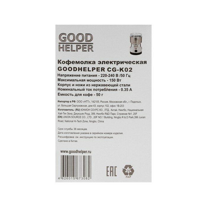 Кофемолка Goodhelper серебристая/чернаяВнешний вид и/или характеристики товара могут быть изменены производителем в соответствии с производственным процессом.