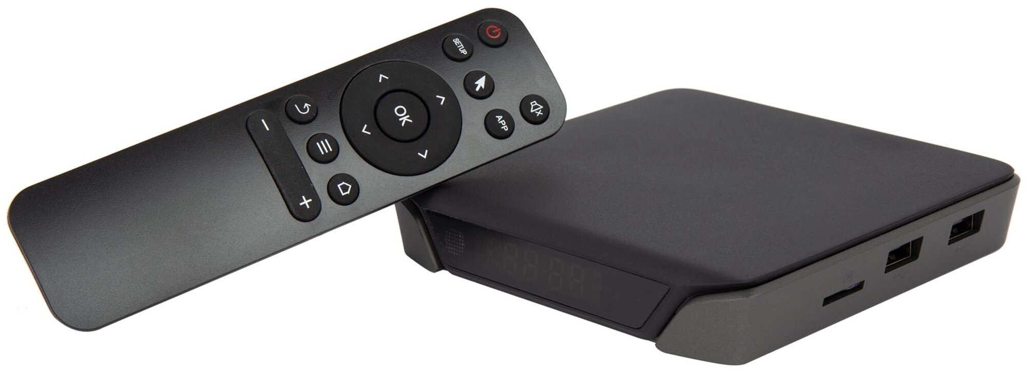 | Устройство оборудовано следующими портами | одним HDMI 2.1, двумя USB 2.0, разъемом питания, LAN 100 Мбит/с, оптическим SPDIF и аналоговым AV выходом mini-jack [3,5 мм], и картридером формата microSDHC. Управление осуществляется с помощью виртуального пульта ДУ на экране смартфона или инфракрасного пульта ДУ, входящего в комплект. |