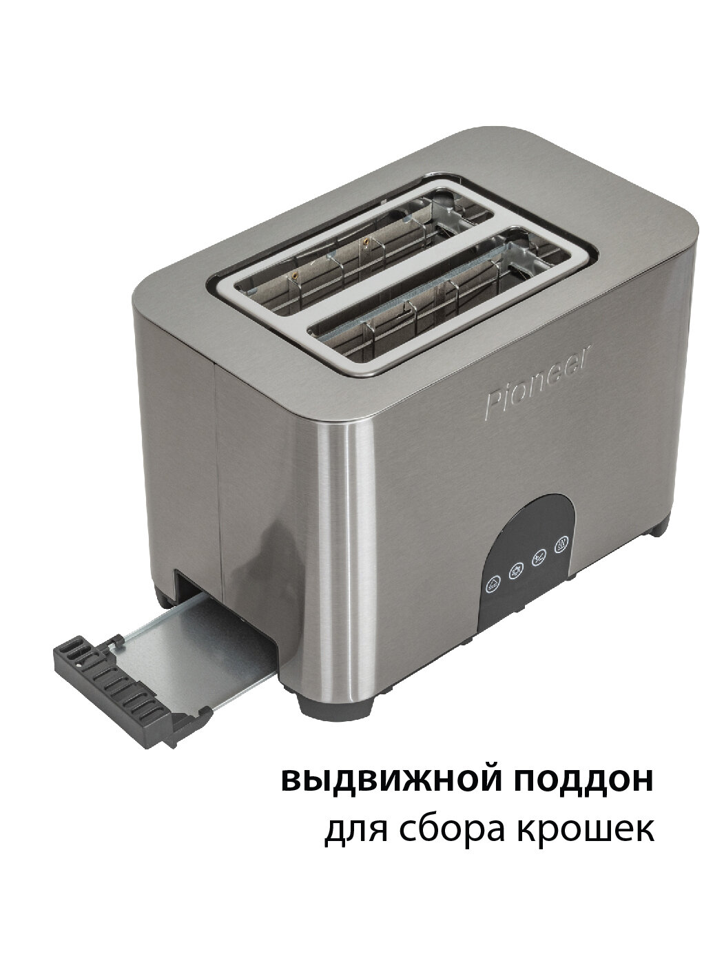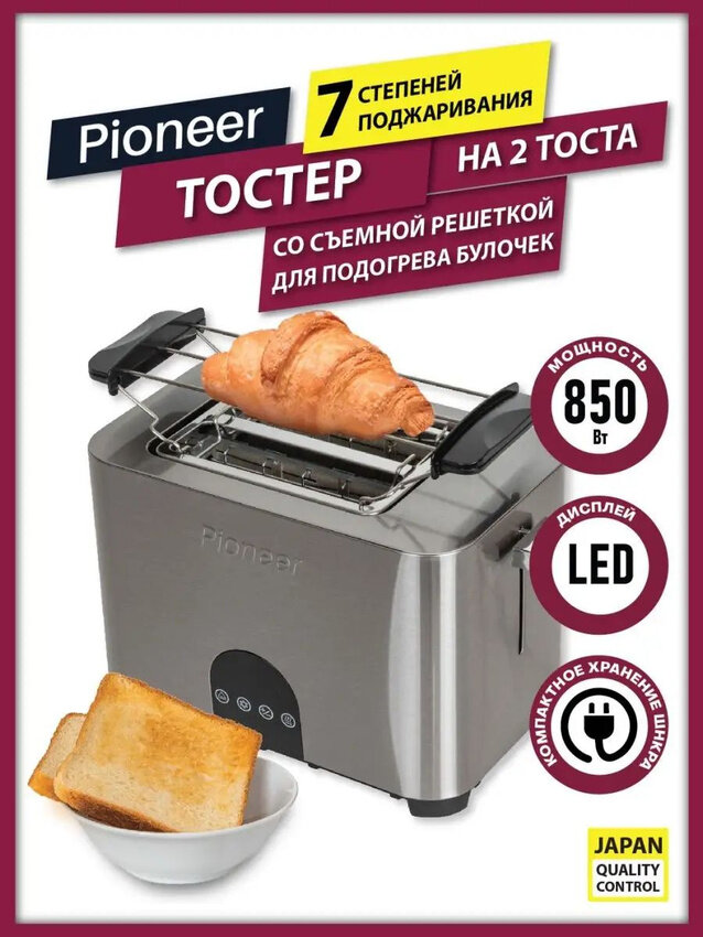 Тостер Pioneer - это устройство, которое станет незаменимым помощником на вашей кухне. Он обладает мощностью 850 Вт и двумя отделениями для одновременного приготовления двух тостов. Корпус тостера выполнен из металла, что гарантирует его долговечность и надежность. Серебристый цвет придает устройству современный и стильный вид. Тостер оснащен двумя отделениями, что позволяет одновременно готовить два тоста. Тостер имеет 6 степеней прожарки, что позволяет выбрать степень прожарки тостов в зависимости от ваших предпочтений. В комплекте с тостером идет решетка для подогрева булочек, что позволит вам рзнообразить свой завтрак и сделать его еще более вкусным.