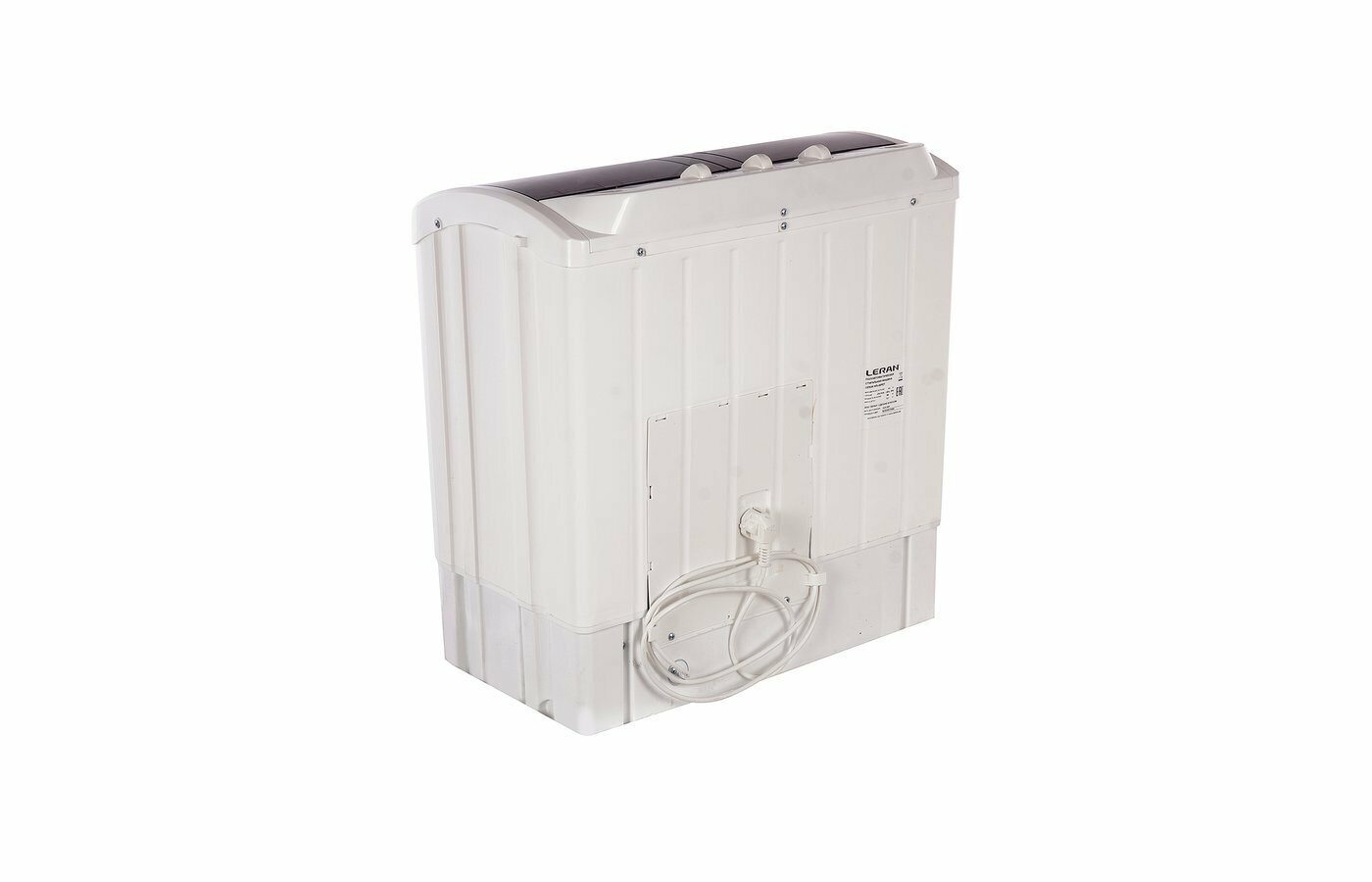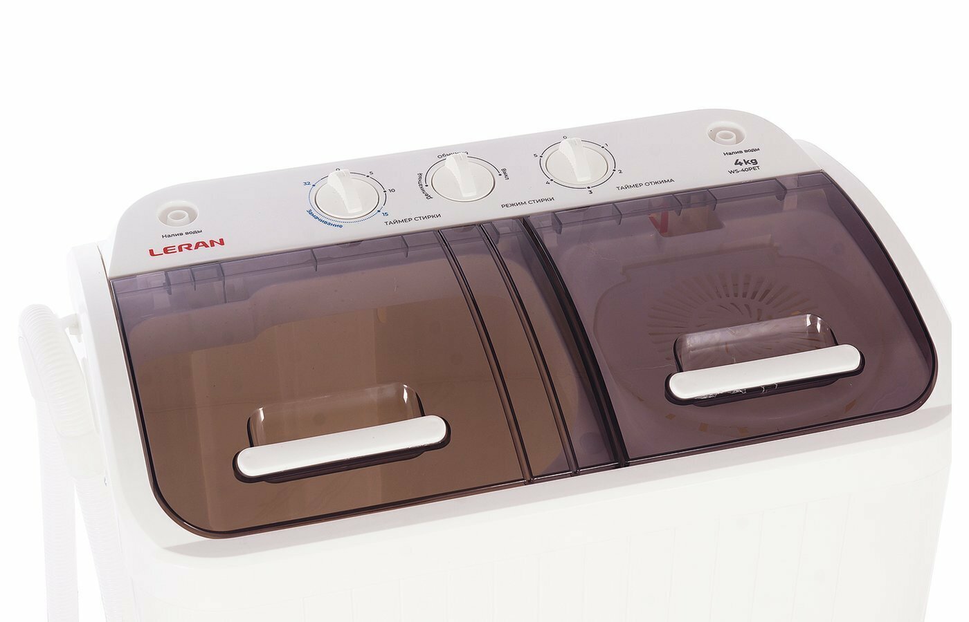 Полуавтоматическая стиральная машина LERAN найдет применение в частном секторе и на даче, коммунальной квартире или при частых переездах. Простая и надежная конструкция имеет малый вес, долговечна и проста в эксплуатации. В компактном корпусе, изготовленном из качественного пластика, расположены два отсека для стирки и отжима. При необходимости постирать большое количество белья возможно одновременное использование обоих отсеков. Встроенная центрифуга работает со скоростью 1350 об/мин, благодаря чему на выходе вы получаете почти сухое бельё Для удобного залива воды в оба отделения на верхней панели расположены два отверстия, к ним подключается универсальный шланг для воды, который подойдет для большинства кранов. В этой модели предусмотрена функция полоскания в центрифуге, она применяется для более эффективного полоскания белья и рассчитана на непрерывный налив-слив воды. Максимальная загрузка белья составляет 4 килограмма. Есть два режима стирки, один из них предназначен для слабозагрязненных вещей и изделий из деликатной ткани, второй подойдет для сильнозагрязненных вещей. Специальный звуковой сигнал сообщит о завершении цикла, а встроенная помпа облегчит процесс слива воды из обоих отделений. Управление простое и понятное, 3 регулятора отвечают за выбор режима, установку таймера стирки и таймера центрифуги. Максимальный интервал таймера стирки с учетом активного замачивания составляет 32 минуты.