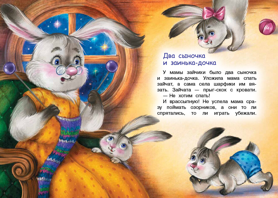 Книга тонкая, включает 2 небольших рассказа. Первый - про непослушных зайчат, которые не хотели спать и убежали ночью из дому от мамы из этого вышло...