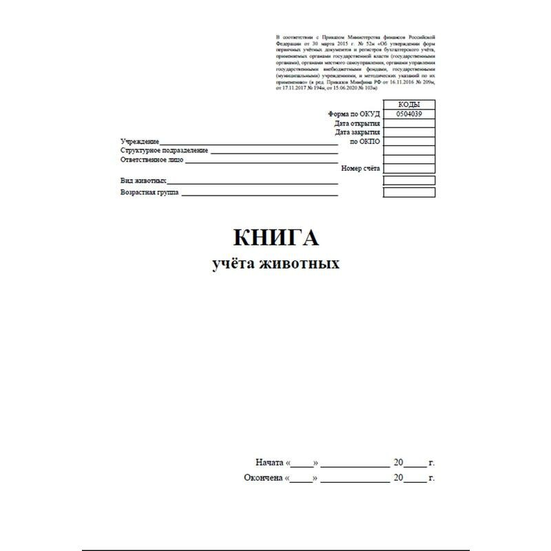 Книга выпущена в соответствии с Приказом Министерства финансов Российской Федерации от 30 марта 2015 г. № 52н «Об утверждении форм первичных учетных документов и регистров бухгалтерского учета, применяемых органами государственной власти (государственными органами), органами местного самоуправления, органами управления государственными внебюджетными фондами, государственными (муниципальными) учреждениями, и методических указаний по их применению» (в ред. Приказов Минфина РФ от 16.11.2016 № 209н, от 17.11.2017 № 194н, от 15.06.2020 № 103н). Графы для заполнения: 1. Дата. 2. Номер журнала операций. 3. Дата поступления (выбытия) животного. 4. Сведения о животном (откуда животное поступило или куда выбыло, привес и другие сведения). 5. Инвентарный номер животного. 6–8. Дебет: — количество голов; — вес, кг; — сумма, руб. 9–11. Кредит: — количество голов; — вес, кг; — сумма, руб. Журнал формата А4 (197×285 мм). Обложка красного цвета из офсетной бумаги 160 г/кв. м с припрессовкой глянцевой пленки. Внутренний блок из офсетной бумаги 65 г/кв. м, 32 листа. Переплет мягкий, на скрепке.