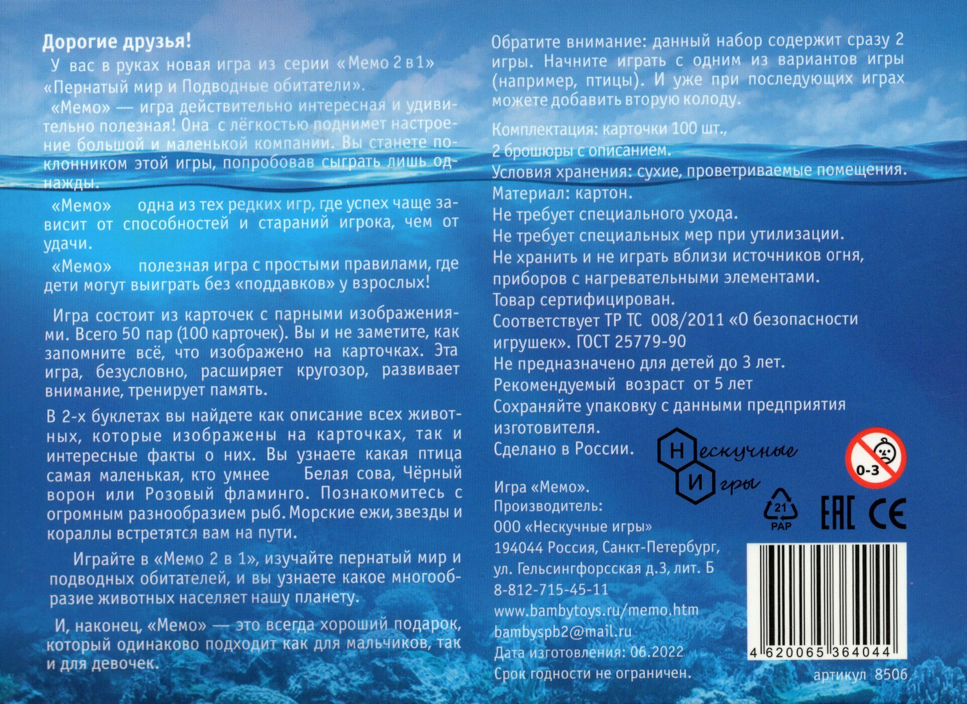 Мемо 2 в 1 Пернатый мир и Подводный мир 100 карточек Нескучные игры