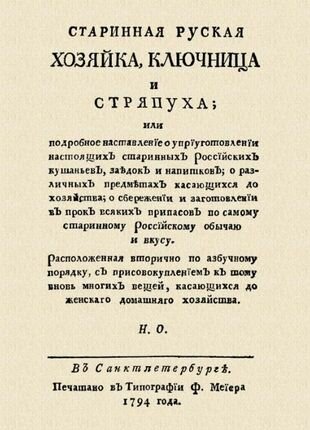 Репринт с издания. СПб. 1794. Рецепты старинной русской кухни. Полное название: Старинная русская хозяйка, ключница и стряпуха; или Подробное наставление о приготовлении настоящих старинных российских кушаний, заедок и напитков; о различных предметах, касающихся до хозяйства; о сбережении и заготовлении впрок всяких припасов по самому старинному Российскому обычаю и вкусу. Расположенная вторично по азбучному порядку, с присовокуплением к тому вновь многих вещей, касающихся до женского домашнего хозяйства. Тираж 30 экз. выполнен по технологии print-on-demand.