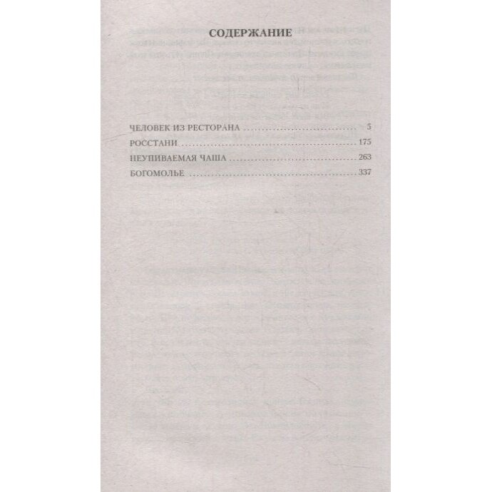 Иван Шмелев вошел в литературу как «художник обездоленных», автор «Бедных людей» ХХ века, и стал «самым русским» из эмигрантских писателей, который выговорил о России всю глубинную правду, создав ее очищенный от случайностей прекрасный образ, одухотворенный высшим смыслом и верой. Шагнув за рамки национальной литературы, творчество Шмелева обрело общечеловеческое значение; его произведения получили европейскую известность и были переведены на десятки языков. Писатель дважды номинировался на Нобелевскую премию по литературе. В настоящее издание вошли повести Ивана Шмелева, написанные в разные годы жизни и представляющие различные грани его творчества: «Человек из ресторана», «Росстани», «Неупиваемая Чаша», «Богомолье».