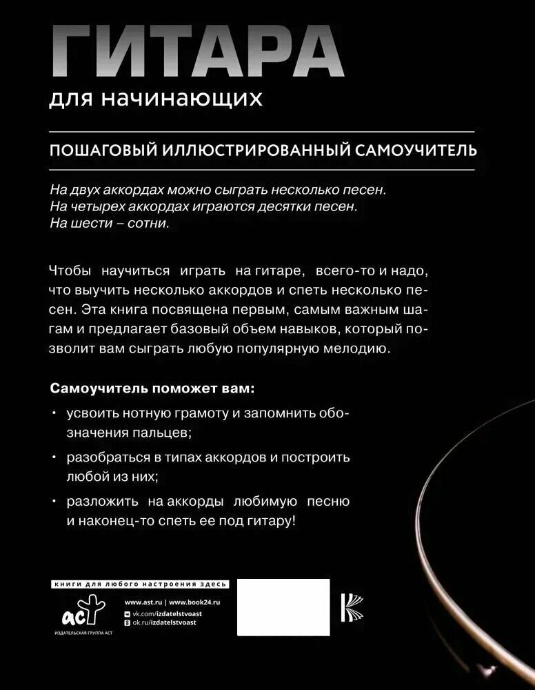 Отличный самоучитель. Данная книга идеально подходит для самостоятельного обучения игре на гитаре, всё начинается с азов, как подобрать гитару, как держать пальцы, что такое лады и как настроить гитару перед игрой. После изучения книги полностью и прохождения всех упражнений вы научитесь играть несложные мелодии и уже сможете развлечь компанию друзей