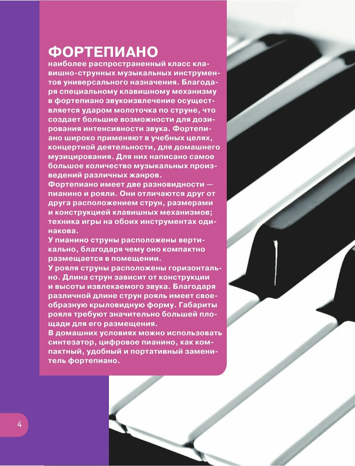 Играть на пианино или домашнем синтезаторе может каждый, независимо от возраста и способностей: нужно просто изучить ноты, разобрать отдельные аккорды и начать осваивать небольшие пьесы. И очень скоро вы перейдете к более сложным произведениям. С помощью этого самоучителя вы сможете сыграть любимые композиции и мелодии, а понятные цветные иллюстрации помогут освоить самые сложные аккорды. Учитесь, играйте и радуйте себя и своих близких!