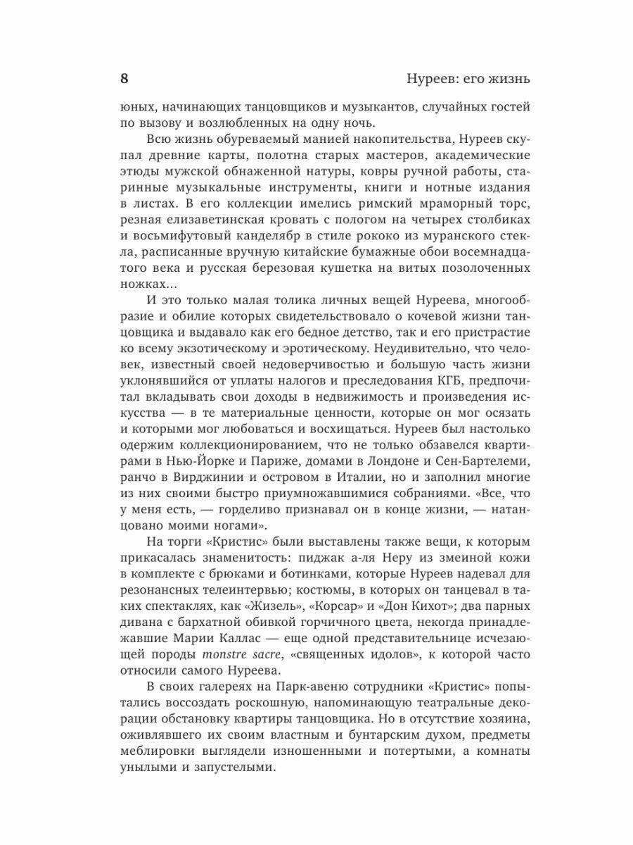 Прочитав несколько книг о Нурееве могу с уверенностью сказать что эта лучшая. С книгой можно пройти шаг за шагом весь путь этого великого танцовщика, все очень грамотно разодрано, приводятся факты, воспоминания, интервью и тд, в общем вся информация которая может быть доступна собрана в этой книге. Советую всем кто интересуется жизнью и творчеством Нуреева ее прочитать, дополнить ее можно лишь книгой воспоминаний Ролана Пети просто как тёплый взгляд друга. Что касается качества печати, это просто газетная серая бумага, описывать особо нечего, иллюстрации отсутствуют, но это все второстепенно по сравнению с ее уникальным содержанием.