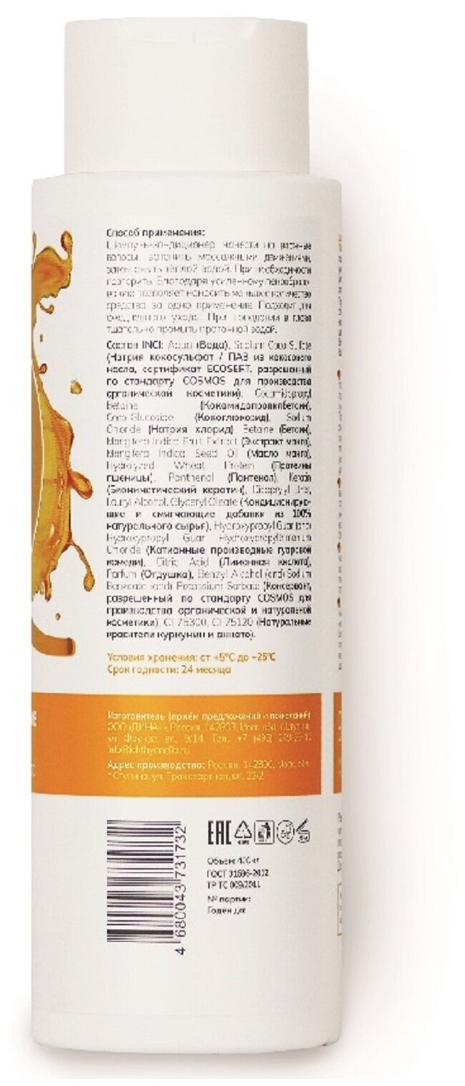 Активы: натуральные щадящие кокосовые ПАВ, протеины пшеницы, биомиметический кератин, пантенол, масло манго.