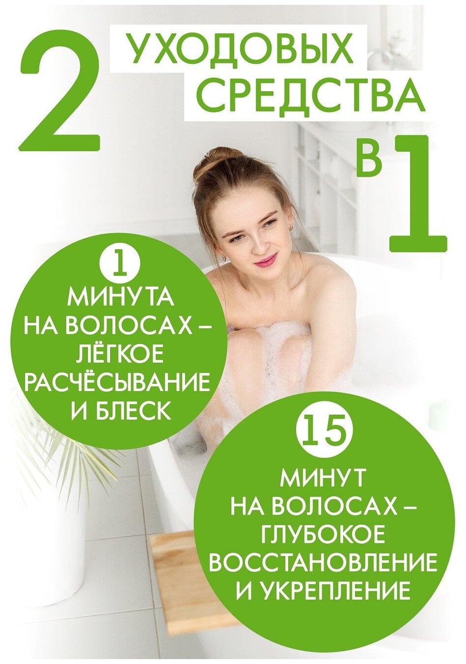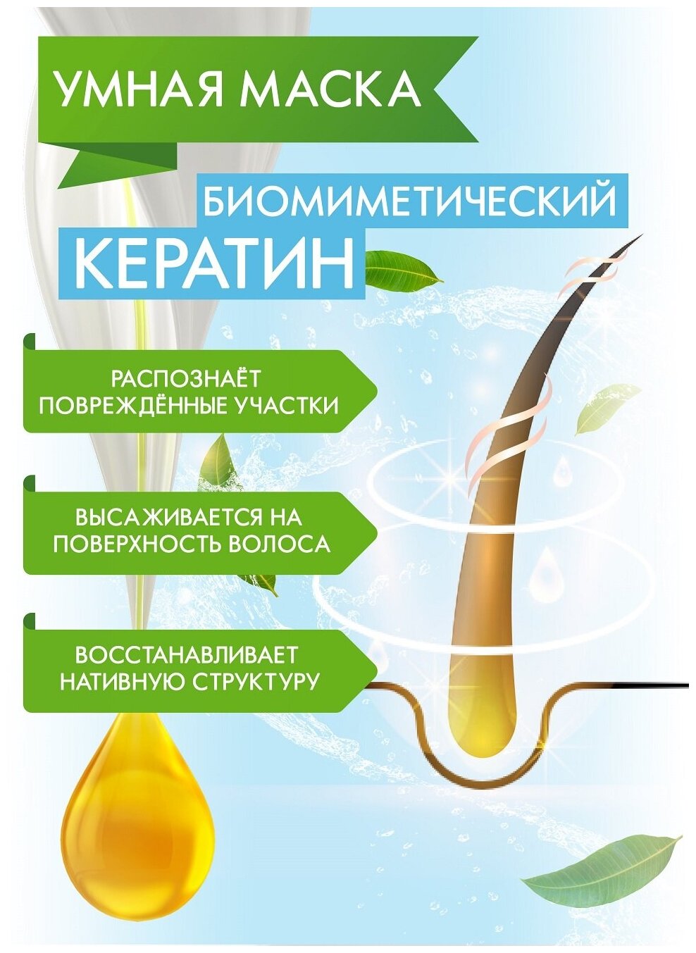 Натуральная формула без силиконов объединяет сразу два уходовых средства для волос – бальзам и маску. Восстановление происходит благодаря «умному» кератину, который распознаёт повреждённые участки волоса и встраивается в них. В зависимости от длительности нанесения продукт подходит как для ежедневного кондиционирования волос, так и для периодического глубокого восстановления. Не содержит силиконов, парабенов и MIT. Не тестируется на животных.