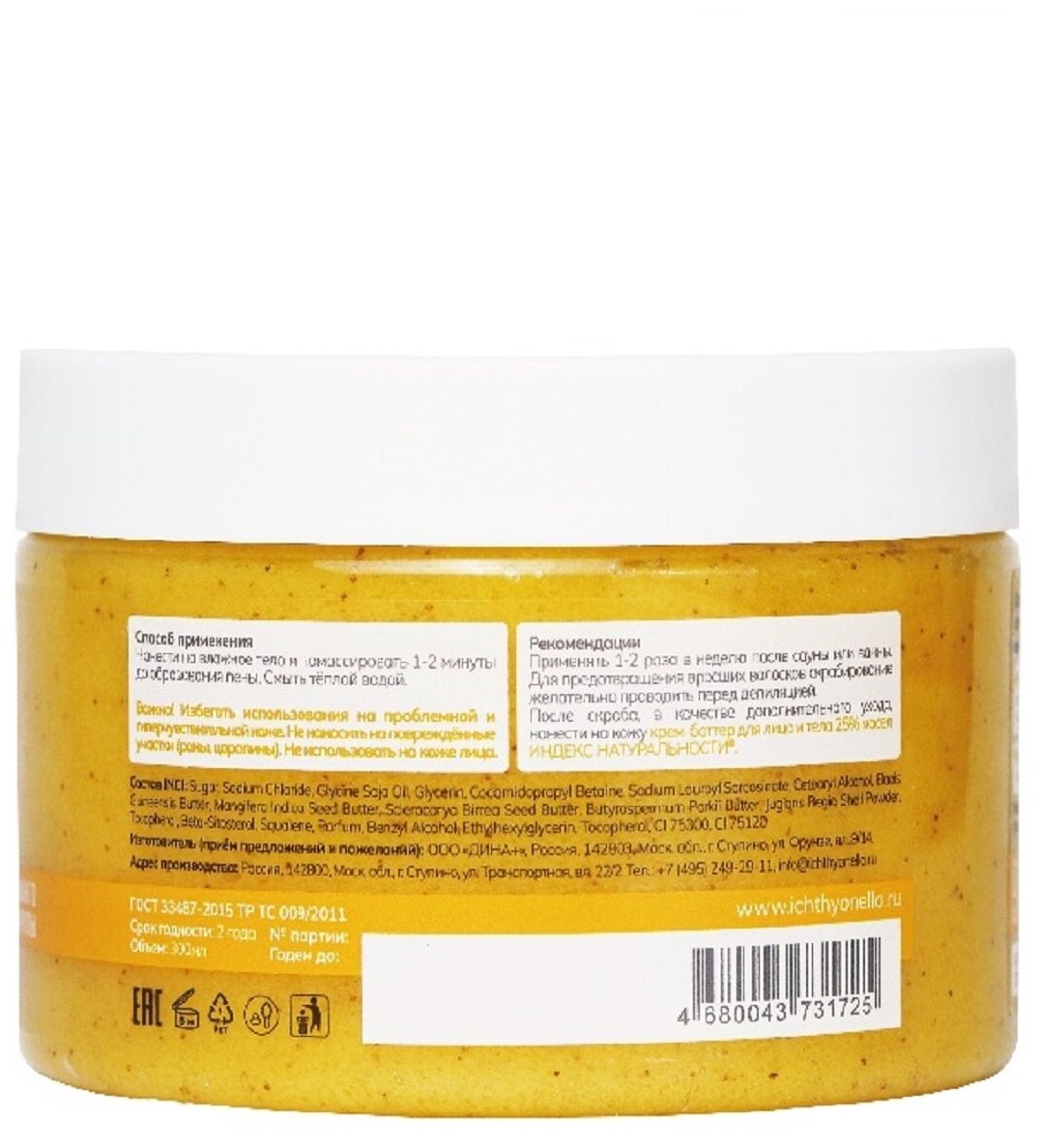 Состав: sugar (сахар), sodium chloride (соль), glycine soja oil (масло соевое), glycerin (глицерин), cocamidopropyl betaine (кокамидопропилбетаин), sodium lauroyl sarcosinate (натрия лауроил саркозинат), cetearyl alcohol (цетеариловый спирт), elaeis guineensis butter (масло пальмовое), mangifera indica seed butter (масло-баттер манго), sclerocarya birrea seed butter (масло-баттер марулы), butyrospermum parkii butter (масло-баттер ши), juglans regia shell powder (пудра грецкого ореха), tocopherol (and) beta-sitosterol (and) squalene (природный антиоксидант), parfum (отдушка), benzyl alcohol (and) ethylhexylglycerin (консервант, разрешенный по стандарту cosmos для производства органической и натуральной косметики), ci 75300, ci 75120 (натуральные красители куркумин и аннато).