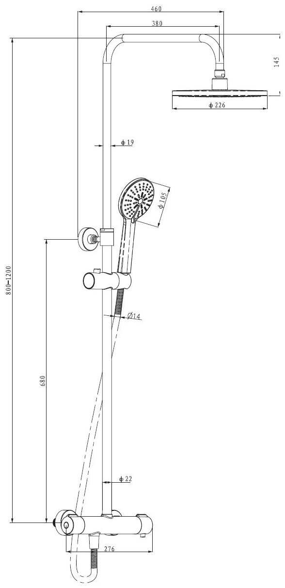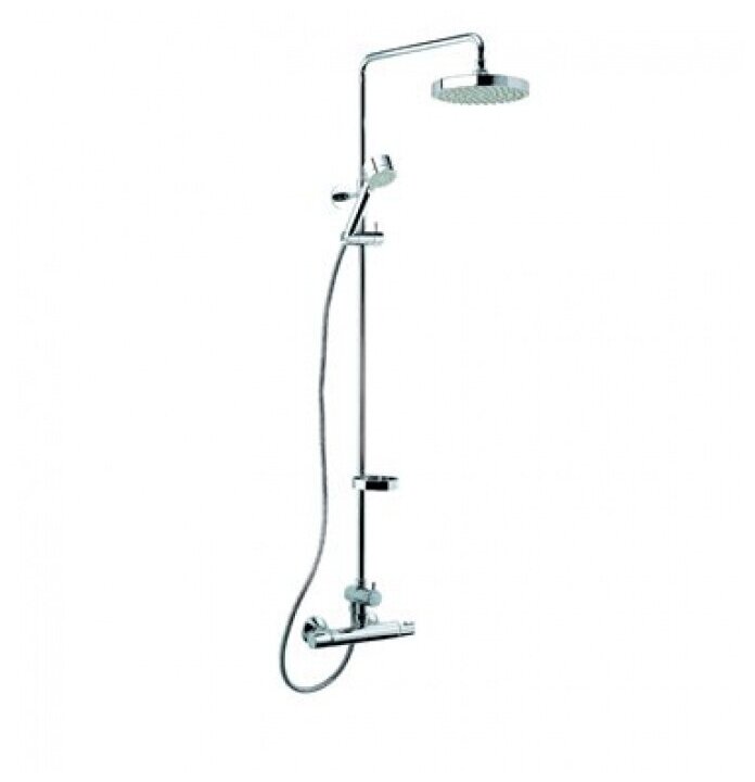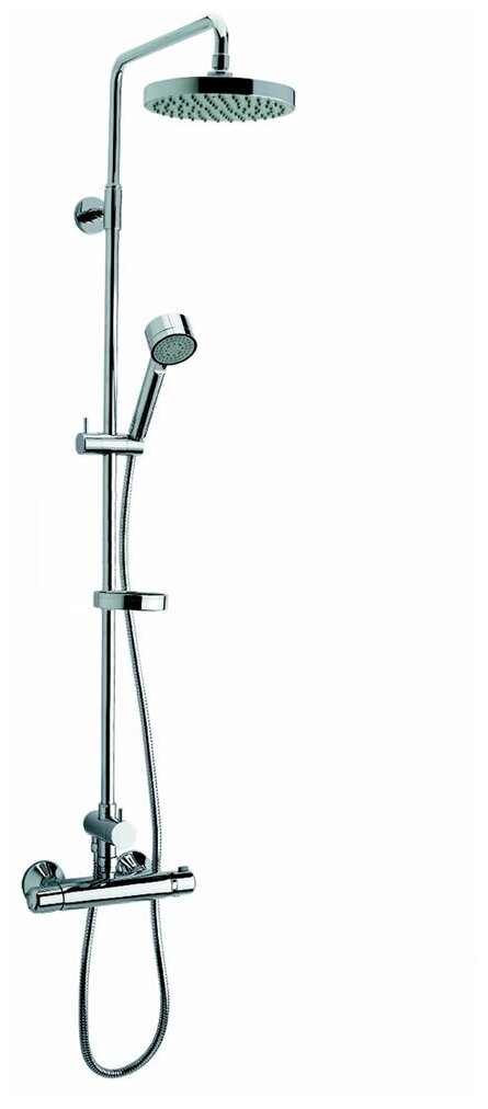 Комплектация: смеситель для душа с термостатом, верхний душ, ручной душ, штанга 800-1200 мм, шланг. Цвет хром.
