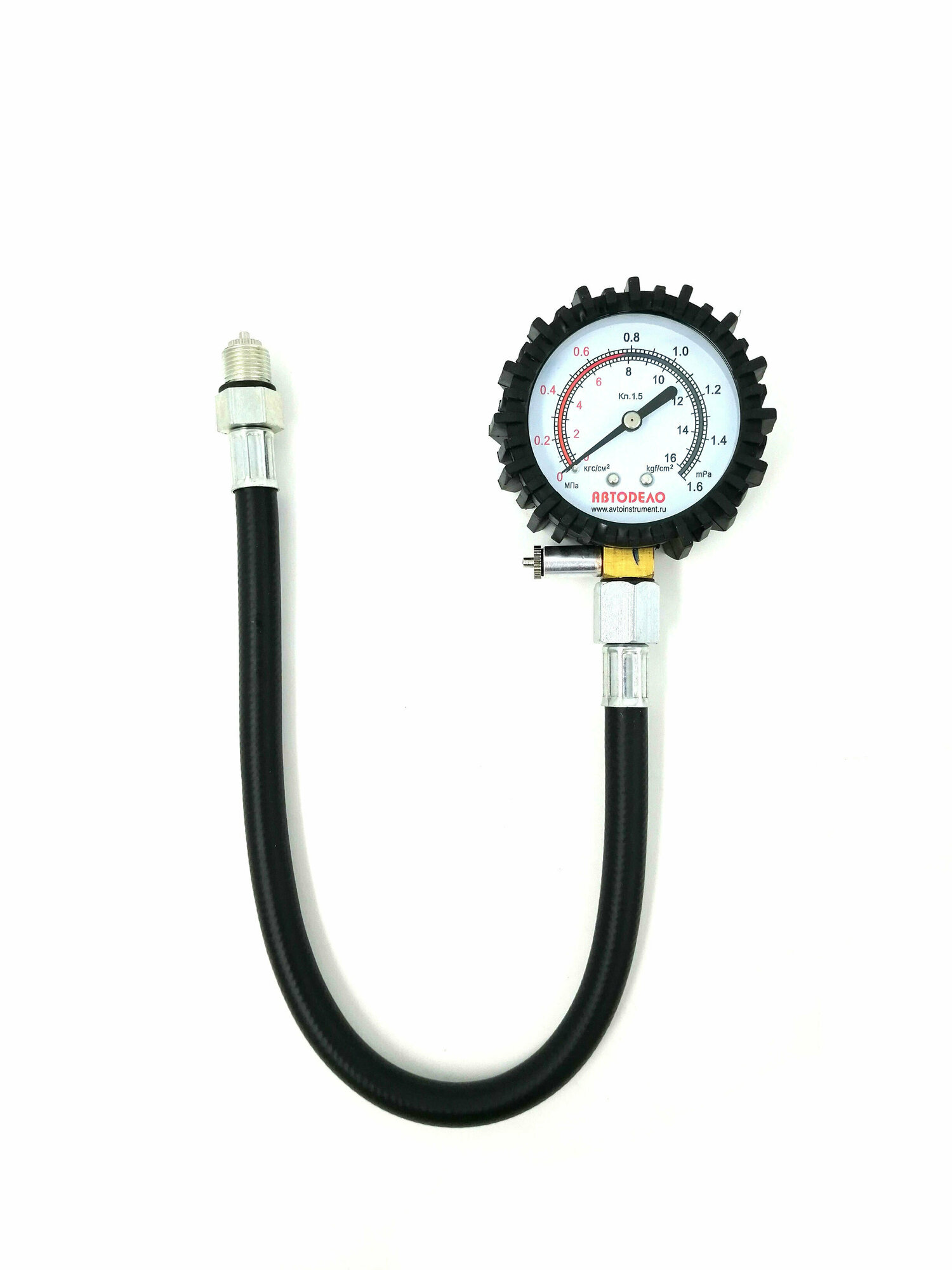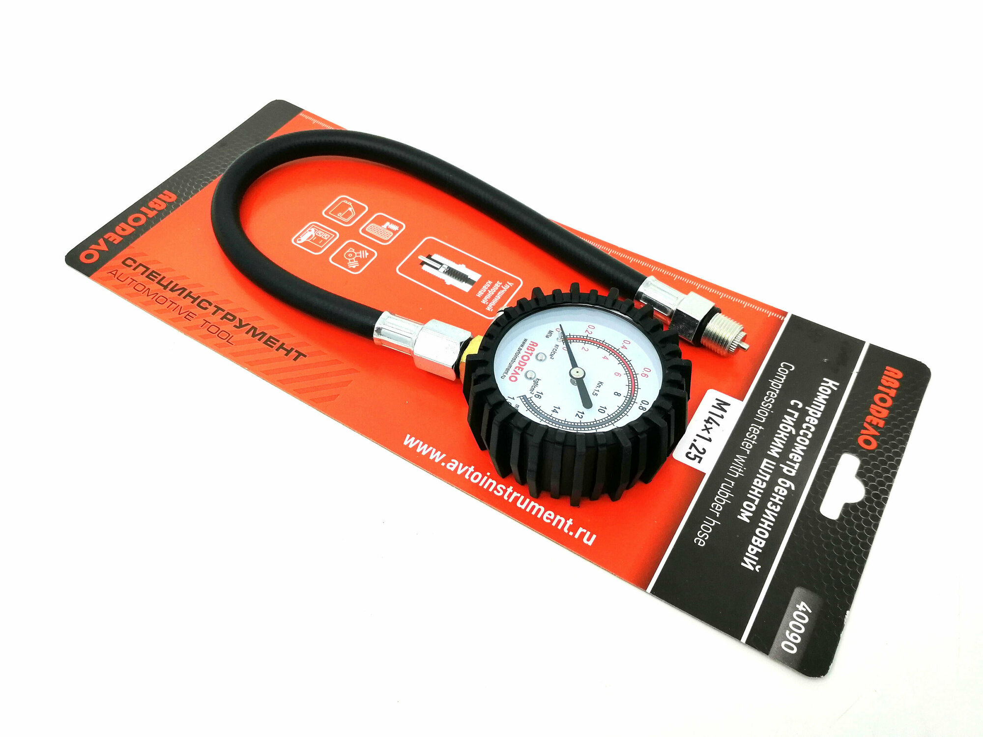 Применяемость - бензиновые двигатели. Максимальное измеряемое давление - 16 кгс/см2. Резьба подсвечу М14 1.25. Имеет клапан сброса давления. Гибкий резиновый шланг высокого давления. Защитный резиновый чехол манометра. Упаковка - блистерная.