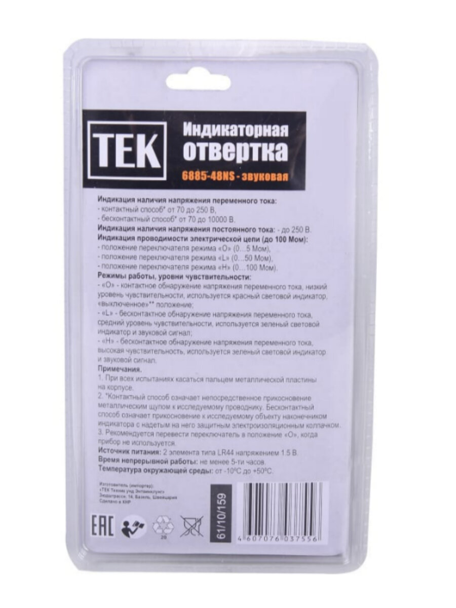 Особенностью этой модели является относительно высокий порог срабатывания по напряжению — более 70 В, поэтому этот тестер невозможно использовать при работе с низковольтными сетями. Устройство может определить обрыв электрической цепи, так как оснащен двумя элементами питания.