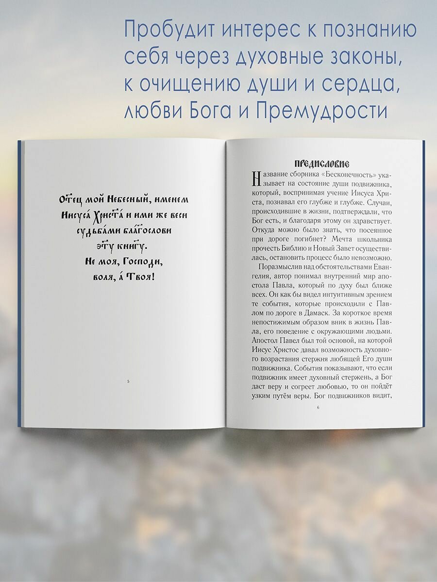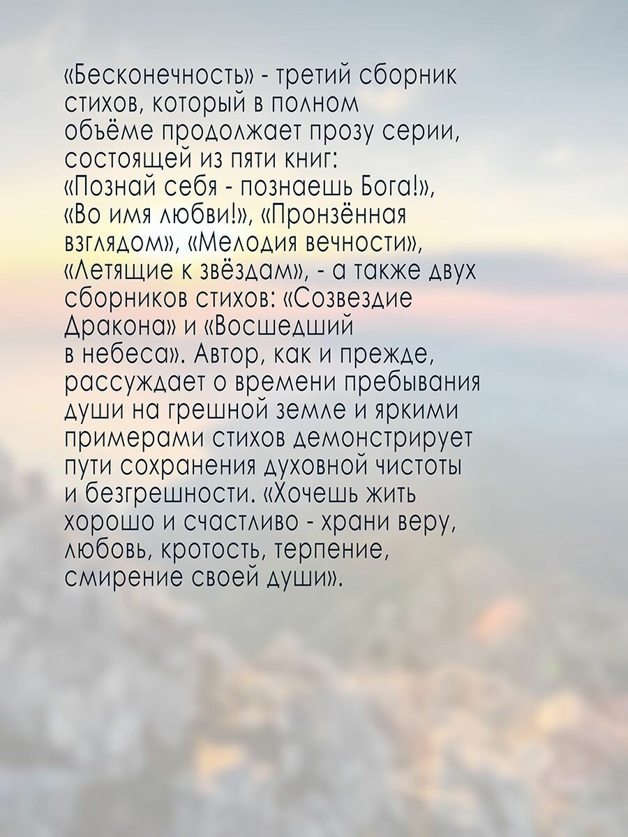 «Бесконечность» — третий сборник стихов, который в полном объёме продолжает прозу серии, состоящей из пяти книг: «Познай себя — познаешь Бога!», «Во имя любви!», «Пронзённая взглядом», «Мелодия вечности», «Летящие к звёздам», — а также двух сборников стихов: «Созвездие Дракона» и «Восшедший в небеса». Автор, как и прежде, рассуждает о времени пребывания души на грешной земле и яркими примерами стихов демонстрирует пути сохранения духовной чистоты и безгрешности. «Хочешь жить хорошо и счастливо — храни веру, любовь, кротость, терпение, смирение своей души».